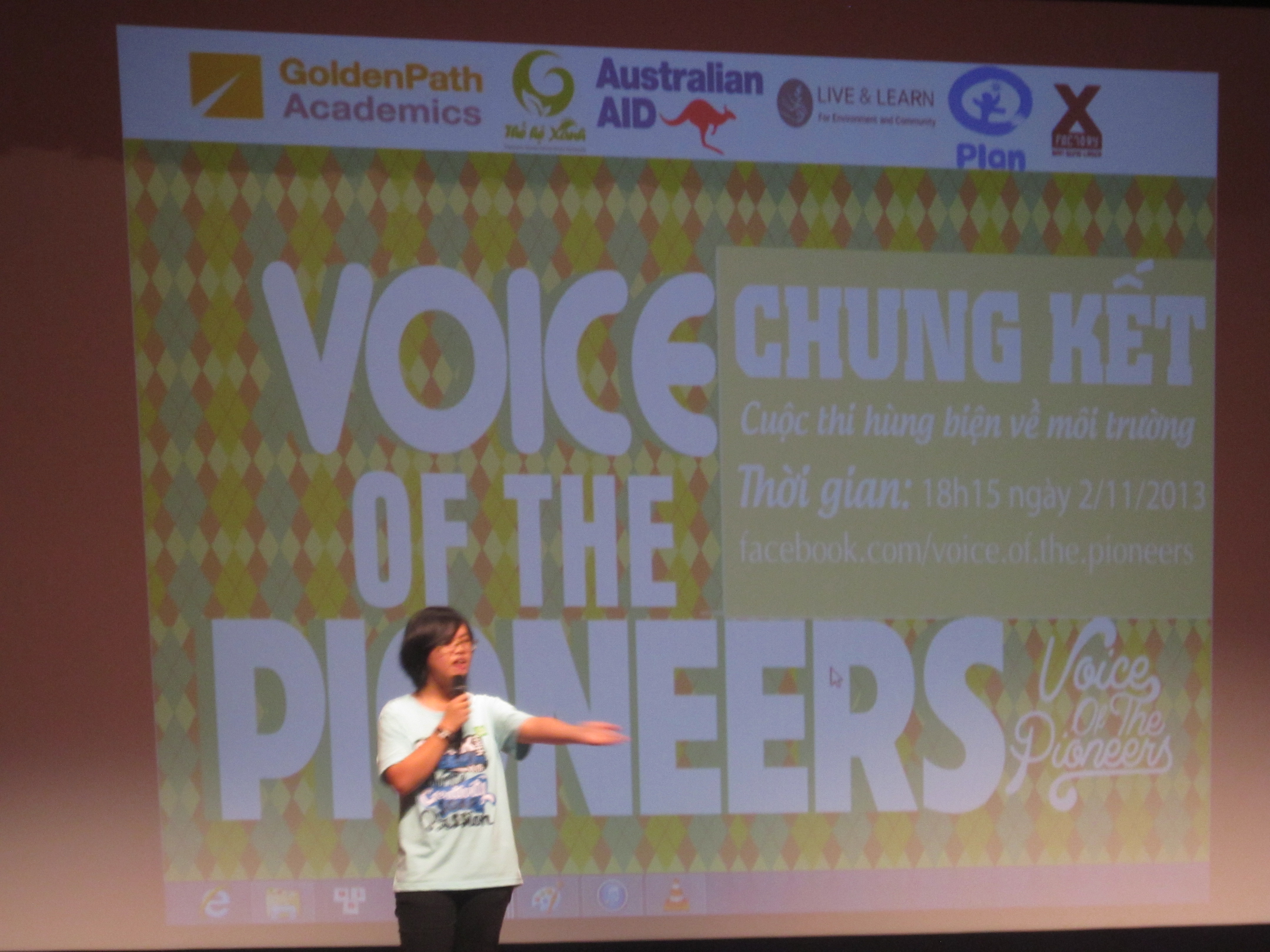 Cuộc thi hùng biện về môi trường “Voice of the Pioneers – Tiếng nói Người tiên phong”, được diễn ra với sự bảo trợ của tổ chức Water Wise Vietnam & Đại sứ quán Hoa Kỳ. Tham dự đêm chung kết có các vị khách mời: Blogger, nhà văn Joe Dâu Tây, bà Đào Thu Hiền - Giám đốc Trung tâm tư vấn du học Golden Path Academics); ông Trần Vũ Toàn (blogger Toàn Shinoda). Ban giám khảo đêm chung kết gồm: PGS.TS Trần Thục – Viện trưởng viện Khoa học Khí tượng Thủy văn và Môi trường; Bà Vũ Mỹ Hạnh – sáng lập và quản lý chương trình Giáo dục tranh biện và tư duy phản biện Vietnam Youth to Debate; ông Nguyễn Đình Dũng – Chuyên viên phòng Khoa học Công nghệ và Hợp tác Quốc tế.