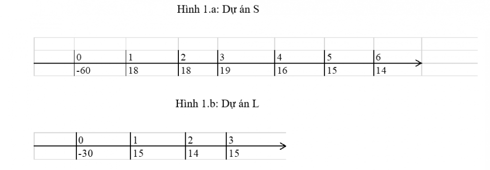Thí dụ 1.1: Công ty Xuất nhập khẩu Giang Châu đang lựa chọn 2 dự án S và L loại trừ lẫn nhau, cả 2 dự án đều cùng mục đích hiện đại hóa quá trình sản xuất. Với lãi suất chiết khấu của 2 dự án là 14%, thể hiện ở Hình 1a và 1.b. (Đơn vị tính: Tỷ đồng).
