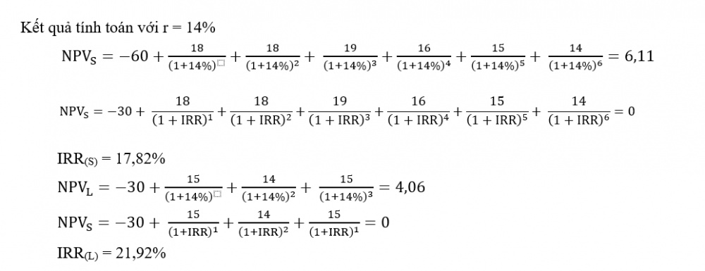 Với kết quả này (Khi dự án L được kéo dài 6 năm) sẽ có NPV(L)=6,79 > NPV(S) = 6,11.