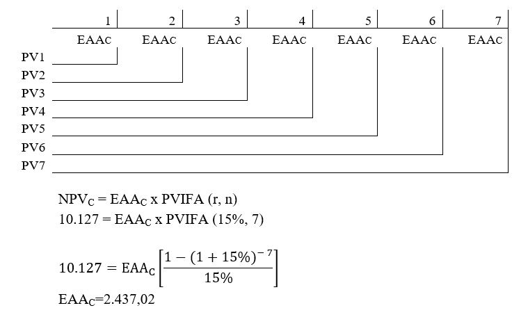 Bước 2: Tìm các chuỗi tiền đều tương đương hàng năm (EAA) cho từng dự án, khi quy về giá trị hiện tại, tổng PV của chúng sẽ bằng NPV của các dự án đã tính ở bước 1.