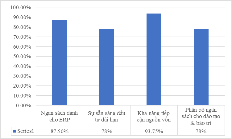 Kết quả khảo sát cho thấy, hầu hết các DN trên địa bàn tỉnh Đồng Nai có sự chuẩn bị ngân sách tốt để sẵn sàng áp dụng ERP trong quản lý kế toán. 56/64 DN có ngân sách chi cho phần mềm, phần cứng, tư vấn và đào tạo đầy đủ, đạt tỷ lệ 87.5%; 78% DN (50/64 DN) phân bổ ngân sách cho đào tạo và bảo trì, có đầy đủ ngân sách dành riêng cho đào tạo nhân sự và bảo trì, nâng cấp hệ thống sau triển khai. Điều này phản ánh mức độ quan tâm và đầu tư của DN trong việc đầu tư và hoạch định nguồn vốn cho phát triển công nghệ trong vận hành sản xuất và kinh doanh để quản lý trong bối cảnh chuyển đổi số, nhận thức về việc ERP là đầu tư dài hạn, chấp nhận chi phí ban đầu cao để đổi lấy lợi ích lâu dài tốt.