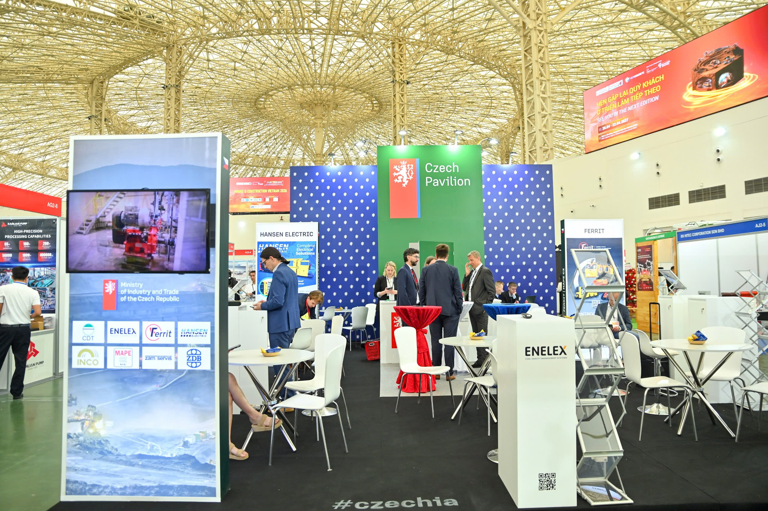 Với tổng diện tích trưng bày hơn 15.000 m² chia làm 2 khuc vực trong nhà và ngoài trời, Triển lãm Mining & Construction Vietnam 2026 thu hút gần 200 doanh nghiệp tham gia đến từ 17 quốc gia và vùng lãnh thổ; 06 khu gian hàng quốc tế đến từ: Séc, Malaysia, Ấn Độ, Trung Quốc, Hà Lan…, nơi giới thiệu các công nghệ đặc thù và thế mạnh quốc gia.