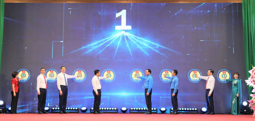 Bộ trưởng Bộ Công Thương Nguyễn Hồng Diên, Chủ tịch Tổng LĐLĐVN Nguyễn Đình Khang, Chủ tịch CĐCTVN Lê An Hải và các đại biểu bấm nút phát động Tháng Công nhân và Tháng Hành động về An toàn vệ sinh lao động năm ngày 29/4/2025