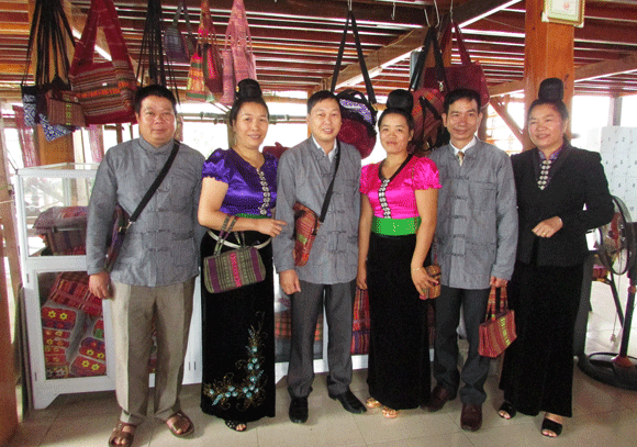 Tại lễ bế giảng lớp học thổ cẩm, các đại biểu (nam giới) mặc bộ áo dài truyền thống do học viên HTX Nặm La thực hiện