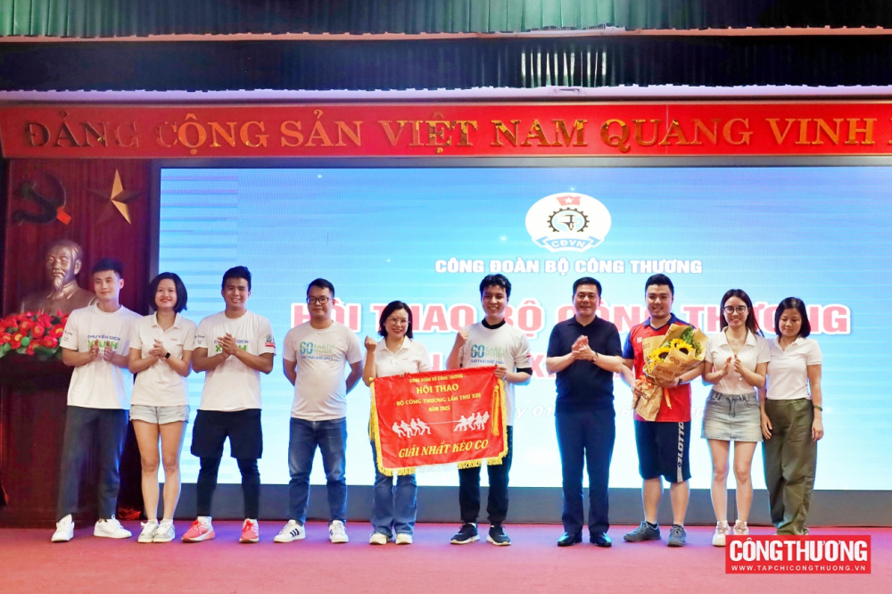 Chủ tịch Công đoàn Công Thương Việt Nam Lê An Hải và Chủ tịch Công đoàn Bộ Công Thương Nguyễn Minh Huệ trao đồng giải Khuyến khích cho tập thể Công ty TNHH MTV Vận hành Hệ thống điện và Thị trường điện quốc gia (NSMO) và Vụ Tổ chức cán bộ tại môn thi đấu Kéo co