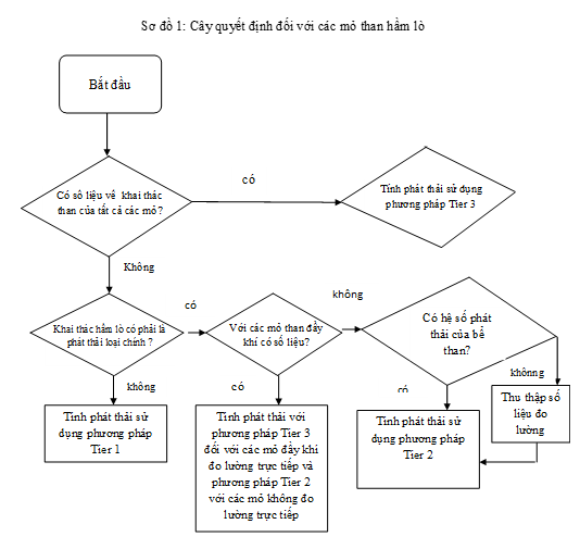 Như đã trình bày ở phần trên với các trường hợp sử dụng các phương pháp bậc 1 hay bậc 2 hoặc bậc 3 sẽ tùy thuộc vào mức độ số liệu có được của mỗi quốc gia. Sơ đồ 1 sẽ hướng dẫn lựa chọn phương pháp tính toán phát thải KNK cho hoạt động khai thác than hầm lò.