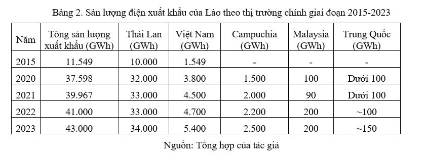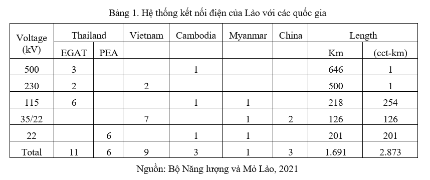Theo Bộ Năng lượng và Mỏ Lào, đến năm 2023, Lào đã vận hành hơn 90 nhà máy thủy điện với tổng công suất trên 11.000 MW, trong đó khoảng 75% sản lượng điện được xuất khẩu (Ministry of Energy and Mines. 2021). Các đường dây truyền tải điện xuyên biên giới giữa Lào và các nước láng giềng, phân loại theo cấp điện áp (kV), số lượng đường dây kết nối với từng quốc gia, cũng như tổng chiều dài các tuyến đường dây thể hiện đối tác chính là Thái Lan (qua EGAT và PEA), tiếp theo là Việt Nam, Campuchia, Myanmar và Trung Quốc (Bảng 1).