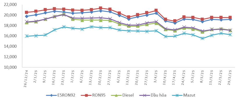 Bình quân giá thành phẩm xăng dầu thế giới giữa kỳ điều hành giá ngày 22/5/2025 và kỳ điều hành ngày 29/5/2025 là: 75,632 USD/thùng xăng RON92 dùng để pha chế xăng E5RON92 (tăng 0,410 USD/thùng, tương đương tăng 0,55%); 76,898 USD/thùng xăng RON95 (tăng 0,172 USD/thùng, tương đương tăng 0,22%); 77,766 USD/thùng dầu hỏa (giảm 1,150 USD/thùng, tương đương giảm 1,46%); 78,650 USD/thùng dầu diesel 0,05S (giảm 1,498 USD/thùng, tương đương giảm 1,87%); 430,884 USD/tấn dầu mazut 180CST 3,5S (giảm 8,592 USD/tấn, tương đương giảm 1,96%).