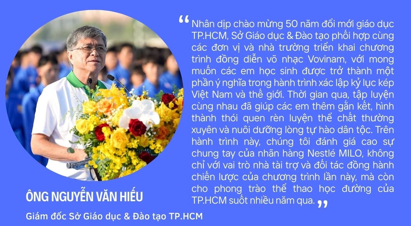Chương trình đồng diễn võ nhạc Vovinam được phát động không chỉ để tuyên truyền, tôn vinh những thành tựu của ngành Giáo dục & Đào tạo TP.HCM trong 50 năm, mà còn đánh dấu cột mốc quan trọng trên hành trình đổi mới giáo dục TP.HCM nói riêng và cả nước nói chung, khi những giá trị của thể dục, thể thao được nâng cao trong giáo dục học đường.