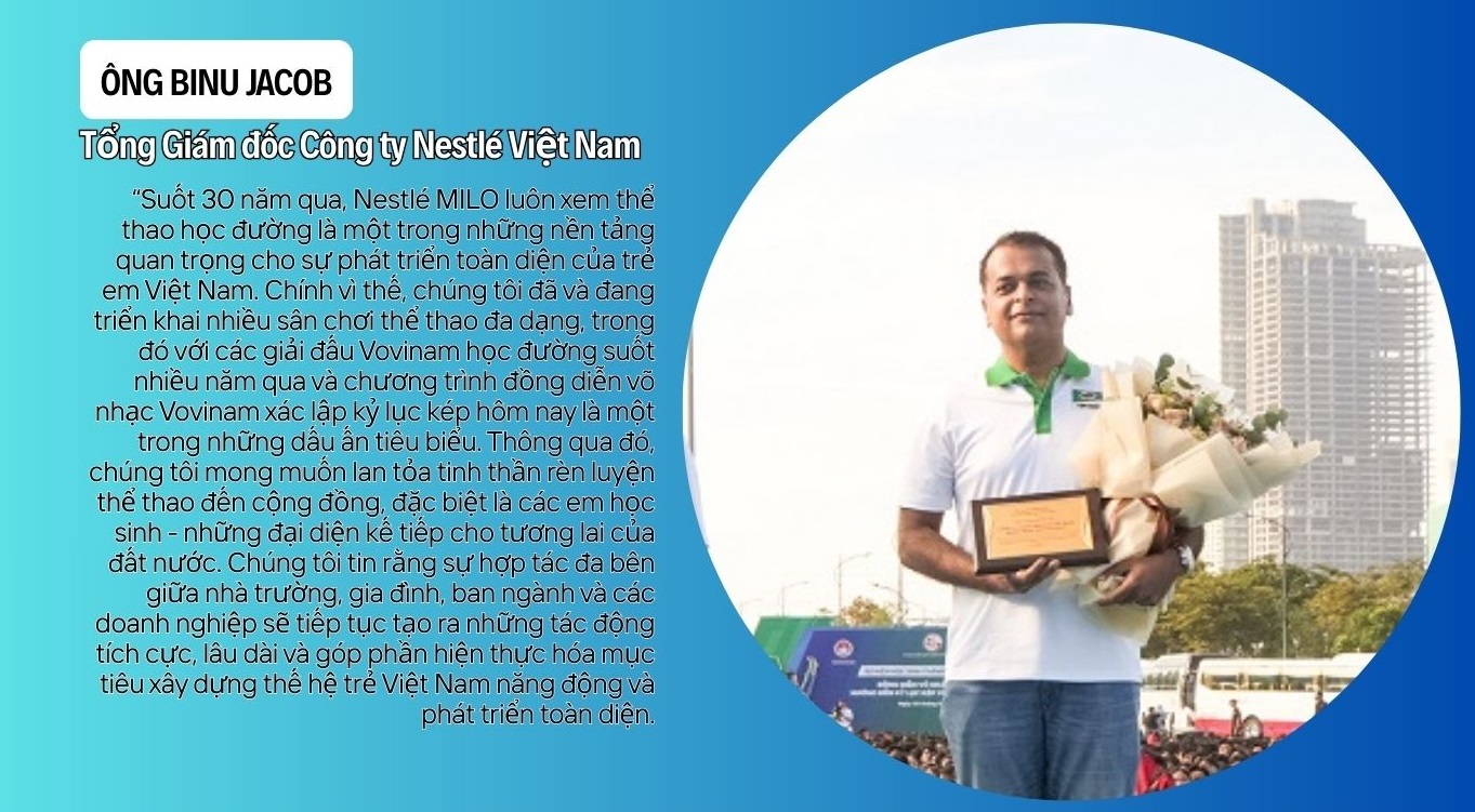 Được công nhận là Di sản Văn hóa Phi vật thể quốc gia, môn võ Vovinam được lựa chọn làm nội dung đồng diễn cho các em học sinh bởi sự phù hợp với thể trạng người Việt và những giá trị đặc trưng của Việt Võ Đạo như tinh thần thượng võ, bản sắc truyền thống và lòng tự hào dân tộc. Thông qua việc tập luyện Vovinam nói riêng và thể thao nói chung, các em học sinh được bồi dưỡng nhiều phẩm chất quý giá cho hành trình trưởng thành như sức mạnh đoàn kết, tinh thần đồng đội, sự tự tin, ý chí, tính kỷ luật và lòng can đảm. Mỗi cá nhân trẻ phát triển toàn diện sẽ góp phần xây dựng nên một thế hệ Việt Nam năng động và sẵn sàng bước vào kỷ nguyên vươn mình của đất nước.