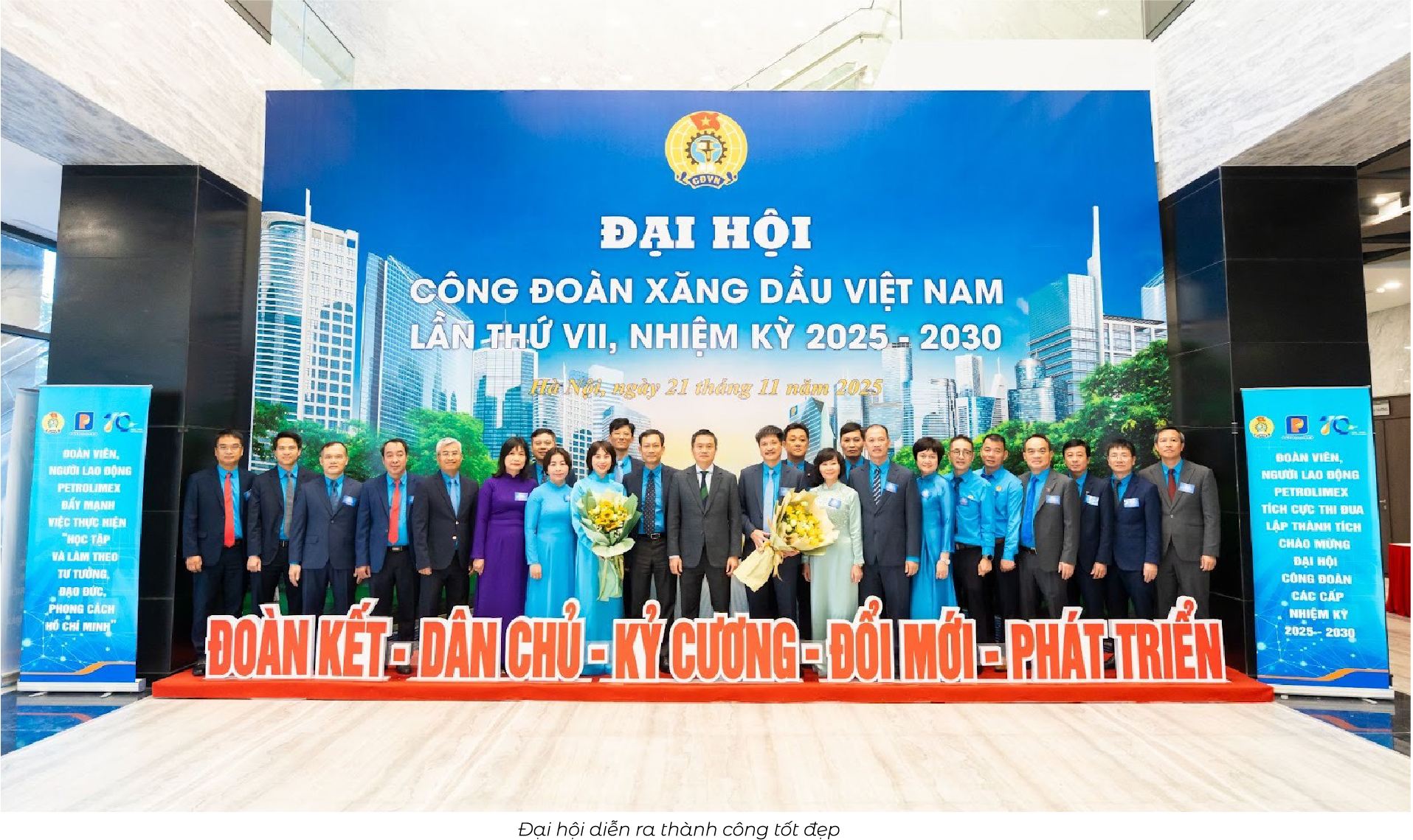 Đại hội Công đoàn Xăng dầu Việt Nam lần thứ VII diễn ra trong không khí dân chủ, đoàn kết và trách nhiệm, đánh dấu bước chuyển mình quan trọng của tổ chức Công đoàn trong kỷ nguyên đổi mới. Mang tinh thần “Đoàn kết - Dân chủ - Kỷ cương - Đổi mới - Phát triển”, Ban Chấp hành khóa mới được tin tưởng sẽ kế thừa truyền thống 70 năm xây dựng và trưởng thành, trở thành điểm tựa vững chắc cho người lao động và là động lực đồng hành cùng Tập đoàn hoàn thành xuất sắc nhiệm vụ trong giai đoạn mới. Thành công của Đại hội là thành công chung, kết tinh trí tuệ và ý chí của hơn 30 nghìn đoàn viên, thể hiện khát vọng xây dựng Petrolimex ngày càng lớn mạnh, phát triển bền vững.