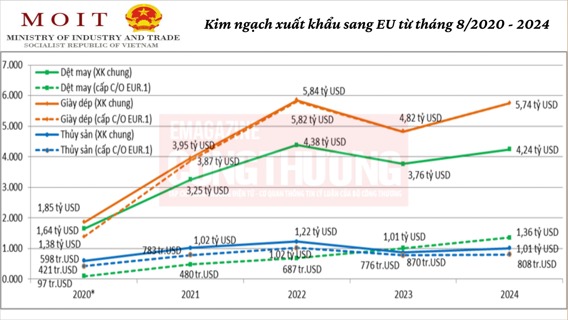 Hay đối với mặt hàng dệt may, thời điểm tháng 8/2020, kim ngạch xuất khẩu dệt may của Việt Nam là 1,64 tỷ USD, đến hết năm 2024 con số đã lên đến 4,24 tỷ USD. Tương tự, số liệu liên quan đến cấp C/O cho mặt hàng này thời điểm 01/8/2020 là 97 triệu USD, đến hết năm 2024 đã đạt đến 1,36 tỷ USD. Đối với mặt hàng này, có thể thấy được khoảng cách khá rộng giữa kim ngạch xuất khẩu thực tế là 4,24 tỷ USD và kim ngạch xuất khẩu có C/O là 1,36 tỷ USD.