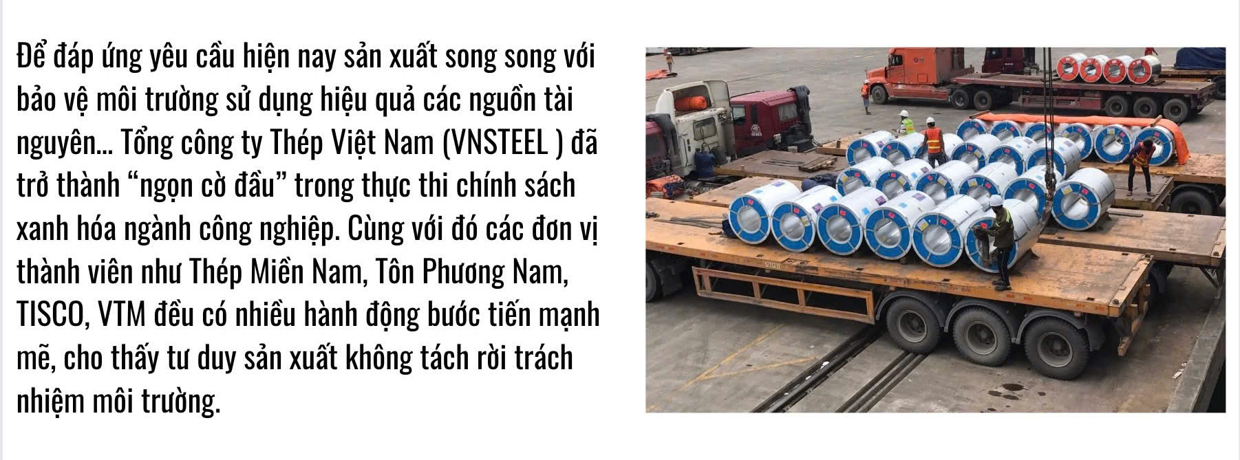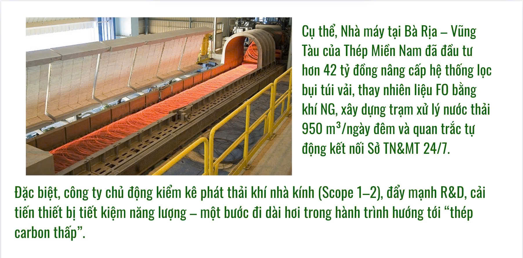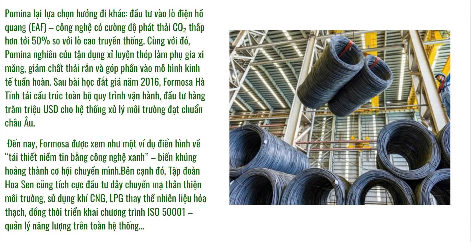 Từ Thép Miền Nam, Tôn Phương Nam trong hệ thống VNSTEEL, đến Hòa Phát, Pomina, Formosa hay Hoa Sen – tất cả đang tạo nên một mạng lưới xanh lan tỏa trong ngành thép Việt Nam. Mỗi đơn vị một cách làm, một hành trình riêng, nhưng cùng chung một đích đến: Giảm phát thải hôm nay – Giữ gìn tương lai mai sau.