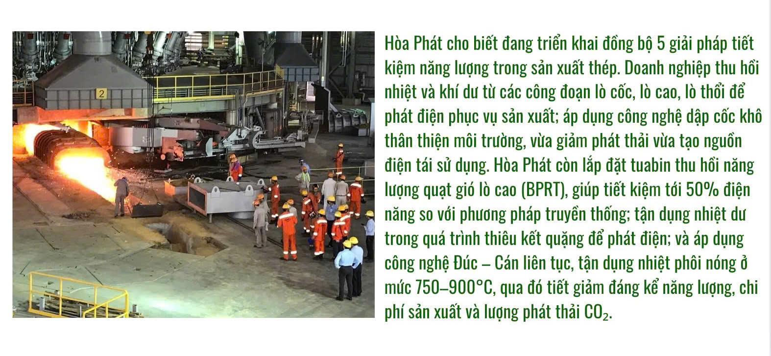 Nếu VNSTEEL là đại diện doanh nghiệp nhà nước trở thành “ngọn cờ tiên phong”, thì khối doanh nghiệp tư nhân lại ghi nhận các “cú bứt tốc” mạnh mẽ trên hành trình xanh hóa. Điển hình phải kể đến là các tập đoàn như Hòa Phát, Pomina, Formosa Hà Tĩnh, Hoa Sen... đều có những đầu tư quy mô lớn với mục tiêu đáp ứng các tiêu chuẩn phát thải và chuẩn bị cho cơ chế CBAM sắp tới.
