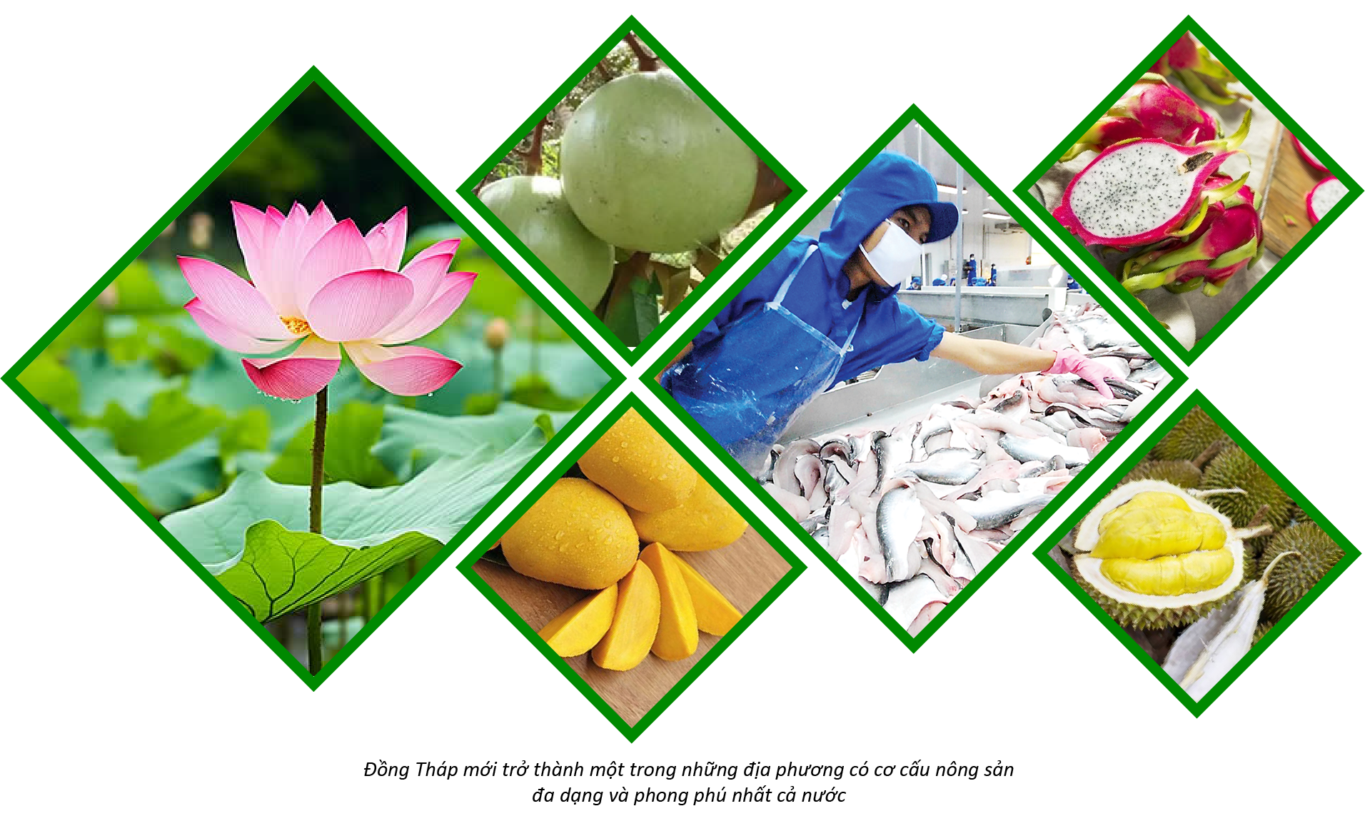 Theo thống kê, toàn tỉnh hiện có trên 25 nhóm ngành hàng sản phẩm nông nghiệp chủ lực và sản phẩm đặc sản địa phương gồm: Đồng Tháp: 05 ngành hàng chủ lực (lúa gạo, cá tra, xoài, sen, hoa kiểng); 07 sản phẩm đặc sản địa phương (xoài Cao Lãnh, Sen Tháp Mười, nem Lai Vung, hủ tiếu Sa Đéc, quýt hồng Lai Vung, ớt Thanh Bình, nước mắm cá linh Hồng Ngự). Tiền Giang (cũ): 07 ngành hàng chủ lực (lúa gạo, thanh long, sầu riêng, chôm chôm, vú sữa, tôm, bò thịt); 6 sản phẩm đặc sản địa phương (vú sữa Lò Rèn, sầu riêng Ngũ Hiệp, hủ tiếu Mỹ Tho, bánh giá Gò Công, mắm tôm chà Gò Công, nghêu Tân Thành). Trong đó, có các sản phẩm đạt OCOP 5 sao như: hạt sen sấy; bột ca cao nguyên chất; hạt ca cao nguyên chất rang; trà trái mãng cầu xiêm. Không ít sản phẩm đã có mặt tại các thị trường khó tính như Mỹ, Nhật Bản, EU.