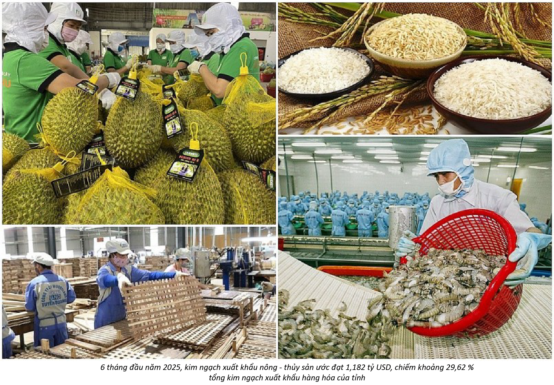 Sáu tháng đầu năm 2025, kim ngạch xuất khẩu nông - thủy sản ước đạt 1,182 tỷ USD, chiếm khoảng 29,62 % tổng kim ngạch xuất khẩu hàng hóa của tỉnh. Song song đó, Đồng Tháp chú trọng phát triển thương mại điện tử, xúc tiến hình thành sàn giao dịch nông sản điện tử và tổ chức hội chợ nông sản quốc tế thường niên, mở rộng thị trường xuất khẩu.