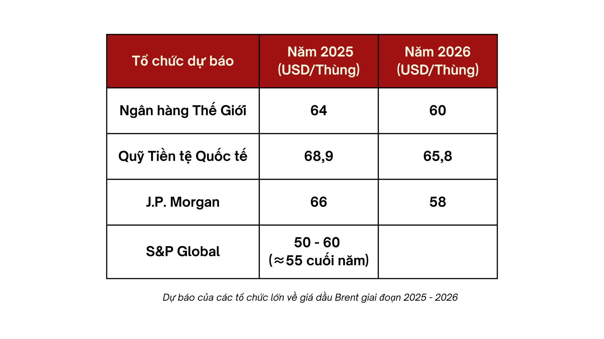 Theo Ngân hàng Thế giới, giá dầu Brent trung bình dự kiến giảm từ 81 USD/thùng năm 2024 xuống khoảng 64 USD/thùng năm 2025 và tiếp tục lùi về mức 60 USD/thùng trong năm 2026. Tương tự, Quỹ Tiền tệ Quốc tế dự báo giá dầu trung bình năm 2025 đạt khoảng 68,9 USD/thùng, giảm gần 13% so với năm 2024, và tiếp tục hạ xuống còn 65,8 USD/thùng vào năm 2026.