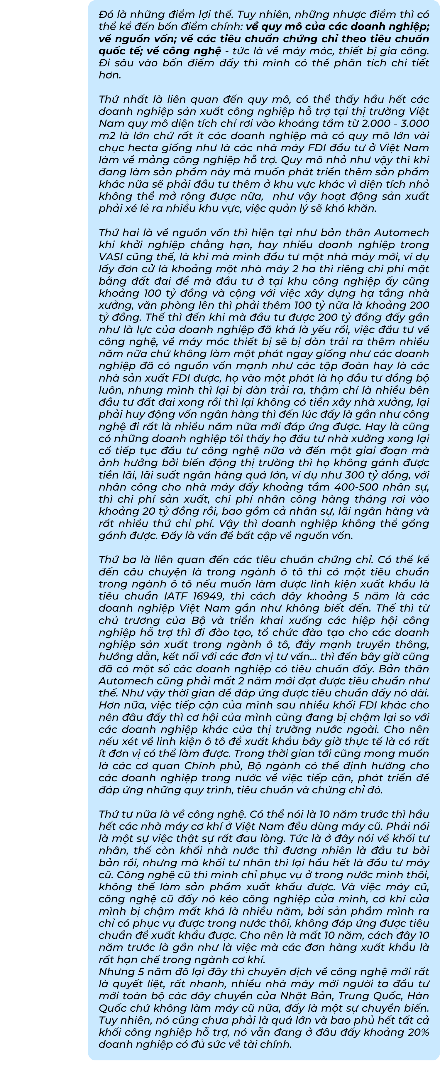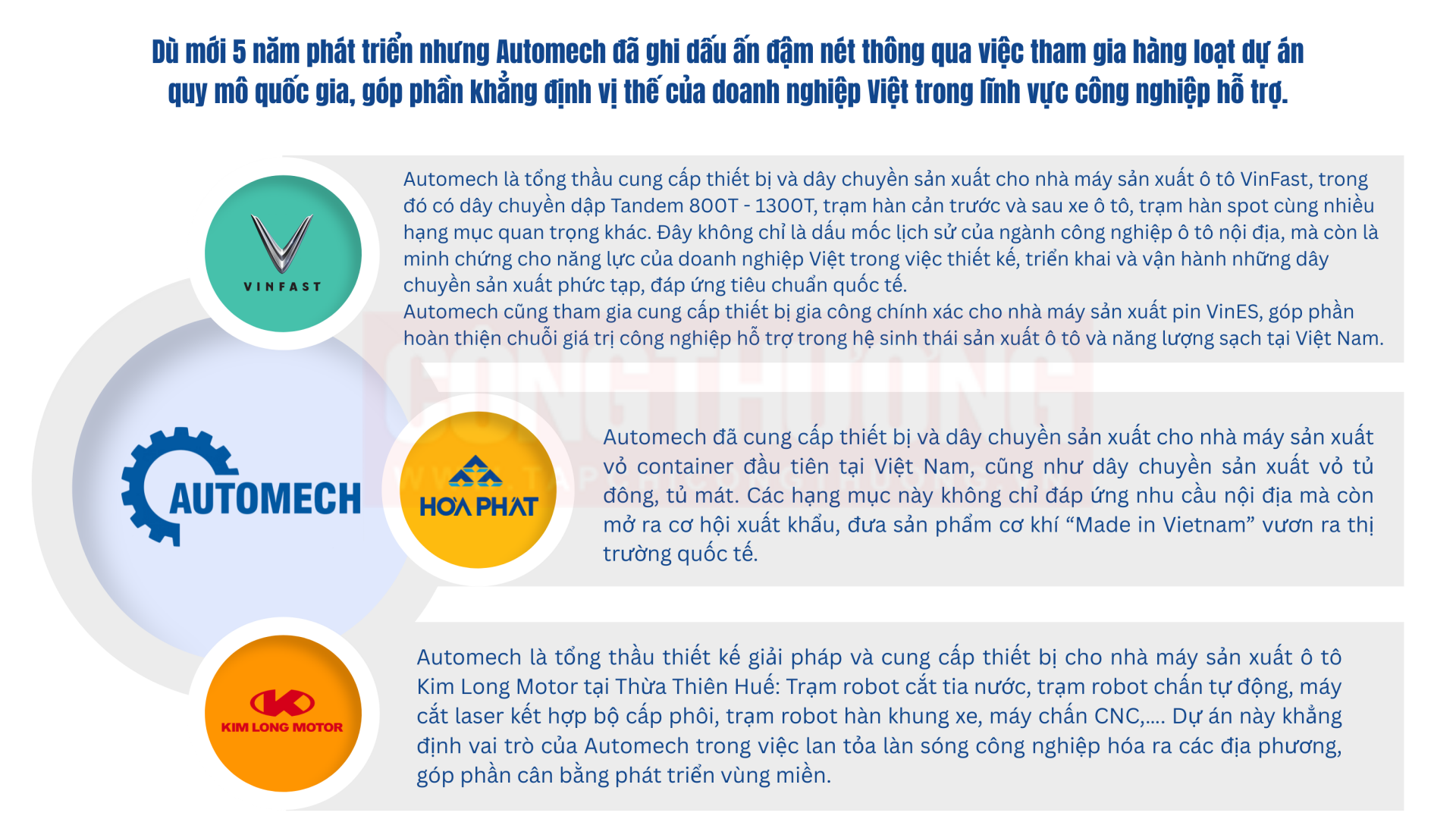 Dù mới hoạt động được 5 năm, nhưng đến nay Công ty Cổ phần Thiết bị và giải pháp cơ khí Automech đã tư vấn và cung cấp giải pháp sản xuất cho hơn 500 đối tác, trong đó có nhiều thương hiệu lớn trong nước như Hòa Phát, VinFast, TC Motor, Rạng Đông… Thành công của doanh nghiệp đến từ nhiều yếu tố, và nhìn rộng hơn, chuỗi cung ứng nội địa vẫn có nhiều cơ hội cho doanh nghiệp Việt.