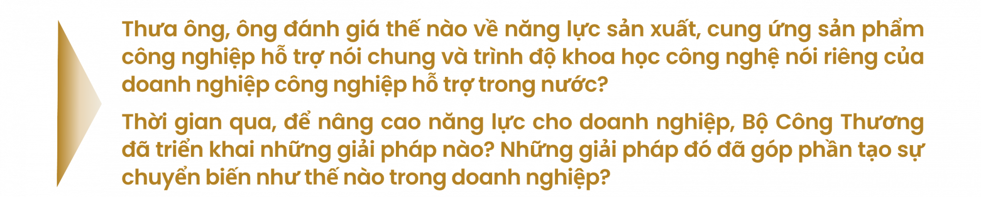 Thứ nhất, xây dựng chương trình phát triển công nghiệp hỗ trợ từ năm 2016 cho đến nay và đã cụ thể hóa được bằng hàng trăm doanh nghiệp tham gia các dự án công nghiệp hỗ trợ về tư vấn cải tiến sản xuất, đào tạo nâng cao chất lượng nguồn nhân lực, chuyển giao công nghệ, sản xuất thử nghiệm và sản xuất thử nghiệm những sản phẩm mới.