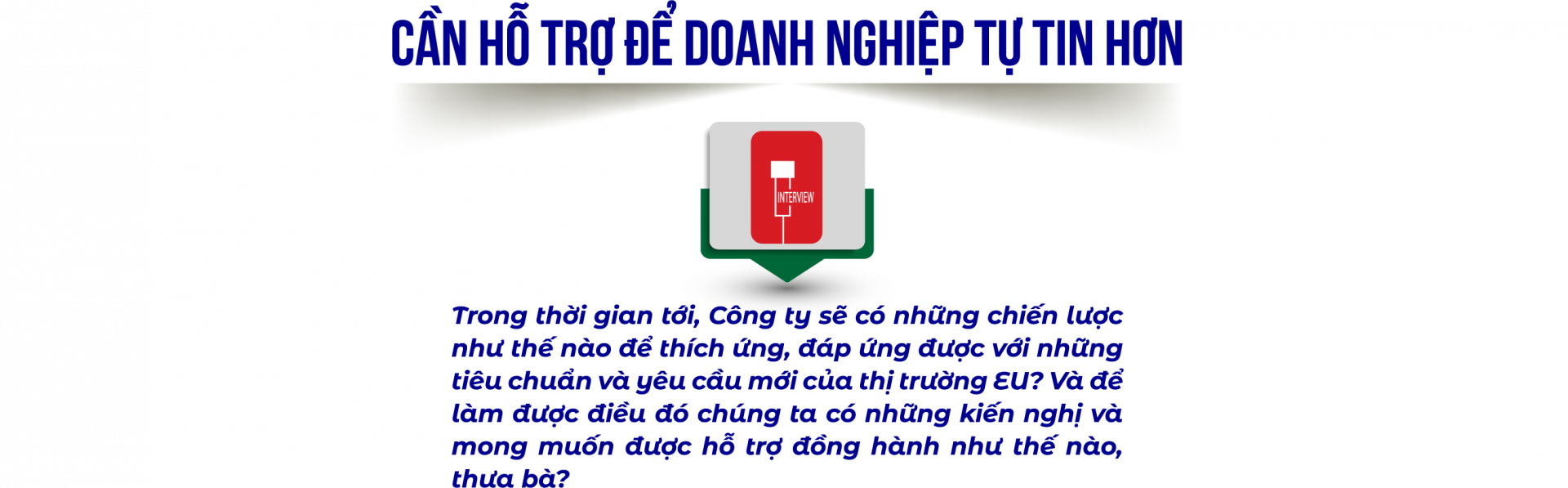 PV: Trong thời gian tới, Công ty sẽ có những chiến lược như thế nào để thích ứng, đáp ứng được với những tiêu chuẩn và yêu cầu mới của thị trường EU? Và để làm được điều đó chúng ta có những kiến nghị và mong muốn được hỗ trợ đồng hành như thế nào, thưa bà?