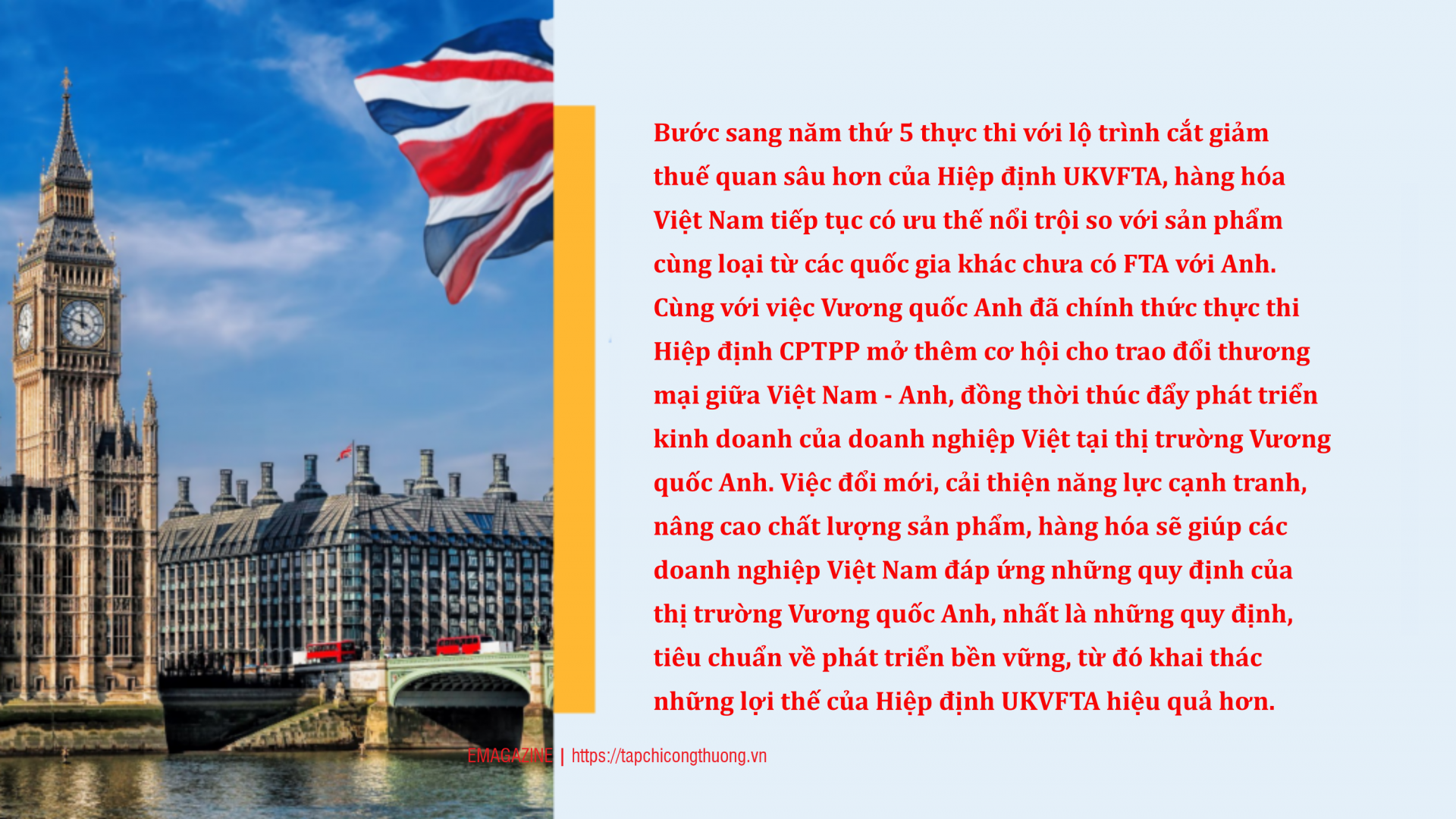 Với quy mô thị trường lớn, cùng lực đẩy từ Hiệp định UVFTA, Vương quốc Anh là điểm đến bứt phá của hàng hóa Việt Nam. Tuy nhiên, đây cũng là thị trường tiêu chuẩn cao với nhiều yêu cầu, quy định liên quan tới phát triển bền vững…