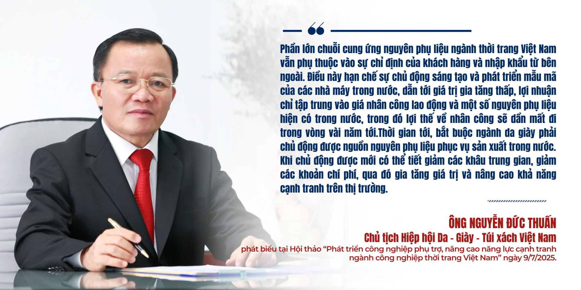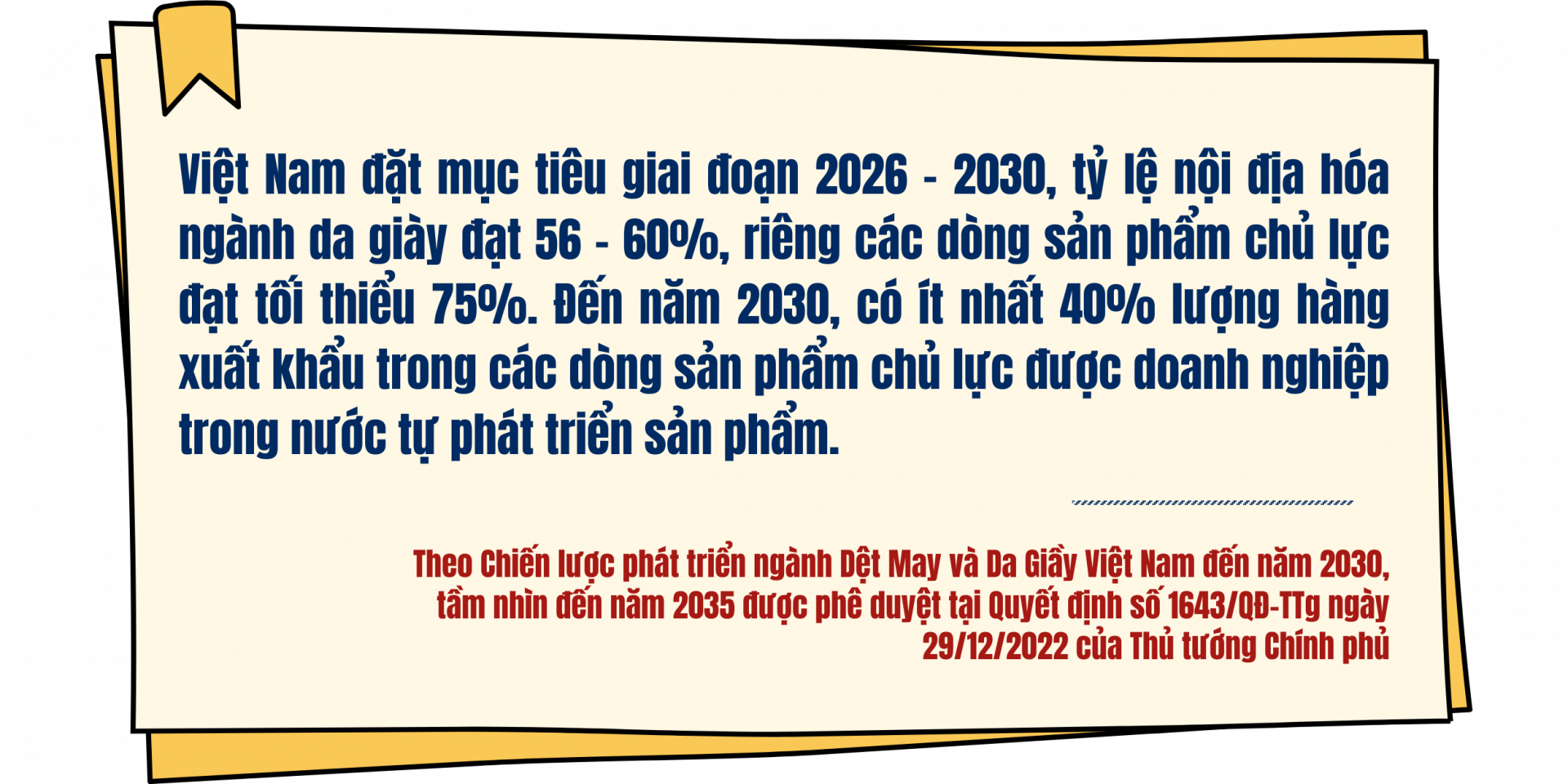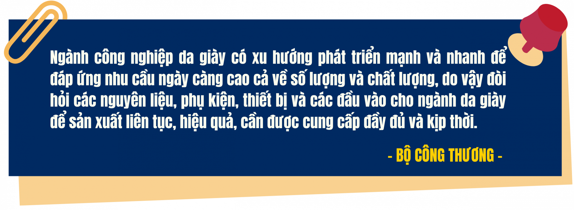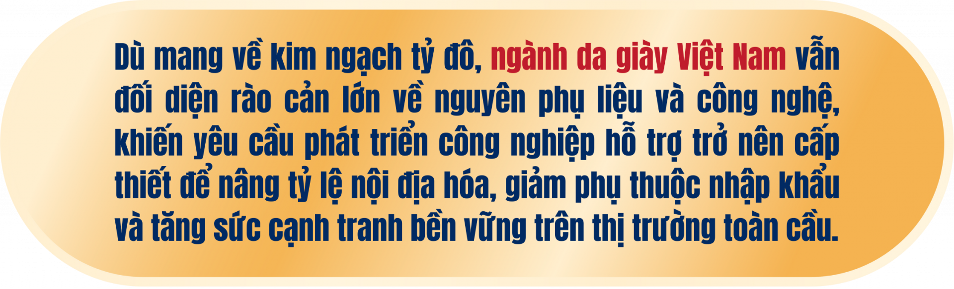 Theo Bộ Công Thương, công nghiệp hỗ trợ giữ vai trò quyết định trong chuỗi giá trị da giày bởi 70% giá trị sản phẩm xuất phát từ nguyên phụ liệu, khuôn mẫu, thiết bị và các dịch vụ kỹ thuật. Khả năng cạnh tranh của một quốc gia vì thế không phụ thuộc tuyệt đối vào số lượng nhà máy gia công, mà phụ thuộc vào mức độ tự chủ nguyên phụ liệu, tốc độ ra mẫu, khả năng phát triển vật liệu mới và năng lực đáp ứng các tiêu chuẩn của thị trường.