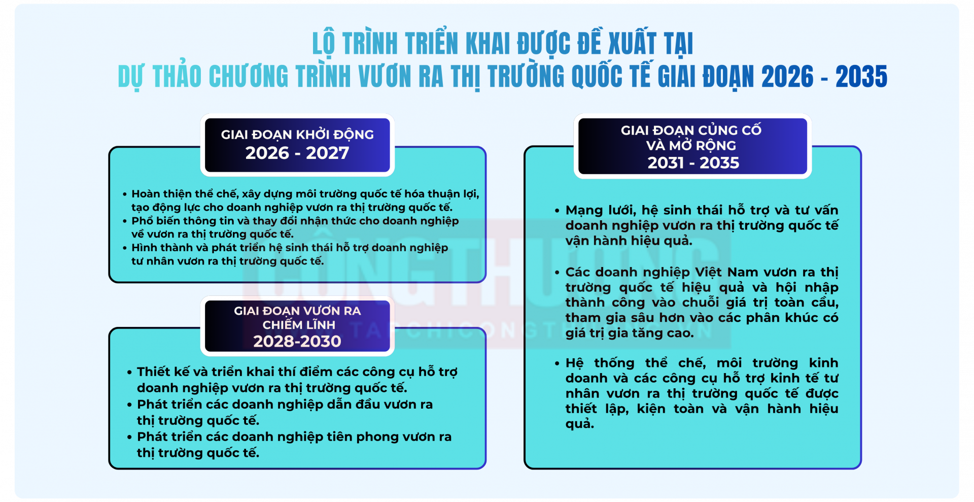 Theo lộ trình, giai đoạn 2026 - 2027 là giai đoạn khởi động, tập trung hoàn thiện thể chế, phổ biến nhận thức và thiết lập hạ tầng hỗ trợ doanh nghiệp. Từ 2028 - 2030, chương trình bước vào giai đoạn “vươn ra - chiếm lĩnh”, triển khai các mô hình đầu tư, xúc tiến thị trường và hỗ trợ doanh nghiệp xây dựng chỗ đứng ở nước ngoài. Đến 2035, hệ sinh thái Go Global được kỳ vọng hoàn thiện và vận hành hiệu quả, giúp doanh nghiệp Việt hội nhập bền vững, trở thành mắt xích quan trọng trong chuỗi giá trị toàn cầu.