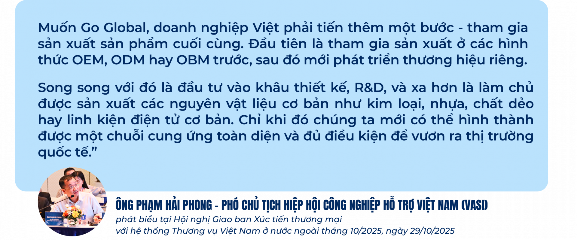 Theo ông Phạm Hải Phong, để doanh nghiệp công nghiệp hỗ trợ Việt Nam có thể “go global” đúng nghĩa, cần hình thành các doanh nghiệp dẫn dắt trong chuỗi cung ứng có khả năng mở rộng hoạt động ra nước ngoài, qua đó tạo sức lan tỏa cho cả hệ sinh thái doanh nghiệp.