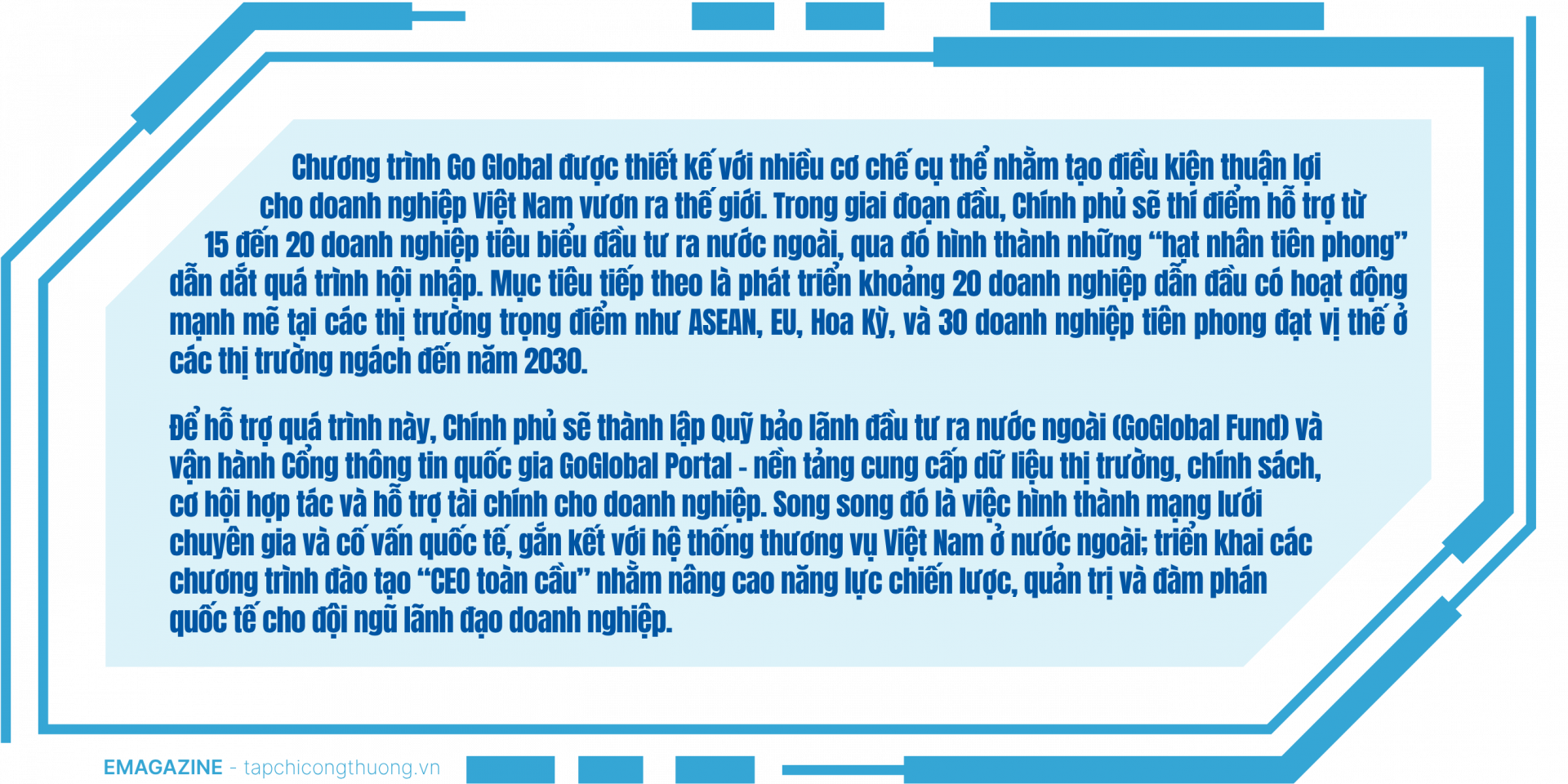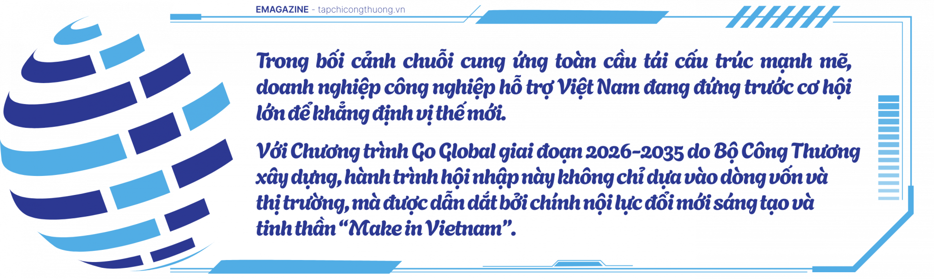 Tầm nhìn dài hạn của Chương trình Go Global là đến năm 2035, Việt Nam sẽ hình thành một thế hệ “Vietnam Global Champions” - những doanh nghiệp dẫn đầu trong các ngành chiến lược, có thương hiệu quốc tế, năng lực R&D, làm chủ công nghệ lõi và đội ngũ nhân lực toàn cầu. Trong bức tranh đó, doanh nghiệp công nghiệp hỗ trợ chính là lực lượng nòng cốt, là “mắt xích” kết nối giữa các ngành từ chế tạo, năng lượng đến công nghệ cao.