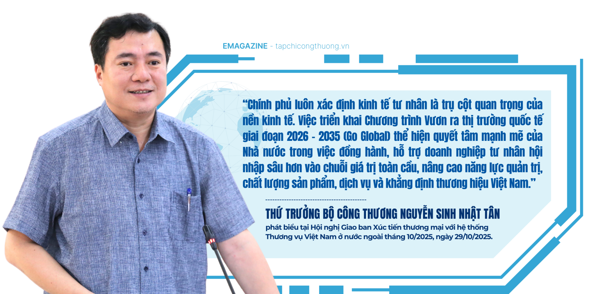 Nhằm cụ thể hóa Nghị quyết 68-NQ/TW về phát triển kinh tế tư nhân, thực hiện nhiệm vụ do Thủ tướng Chính phủ giao, Bộ Công Thương đang chủ trì xây dựng Chương trình "Go Global - Vươn ra thị trường quốc tế giai đoạn 2026 - 2035", hướng tới mục tiêu tạo bệ phóng để doanh nghiệp Việt Nam vững vàng hội nhập, khẳng định vị thế trên thương trường toàn cầu.