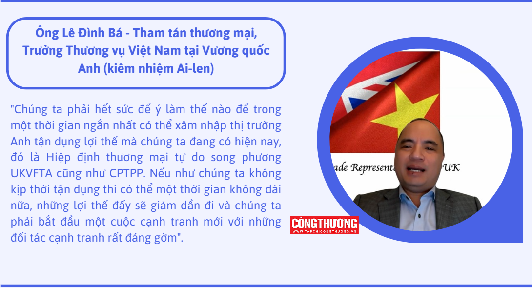 Tuy nhiên, tham tán cũng chia sẻ: Với định hướng đa dạng hóa đối tác, ngoài FTA với Việt Nam, Vương quốc Anh đang rất tích cực mở rộng thị trường, tiến hành đàm phán, ký kết với nhiều đối tác trên thế giới như: Ấn Độ, Thái Lan... ; trong đó có nhiều nguồn cung "đối thủ" cạnh tranh với Việt Nam.