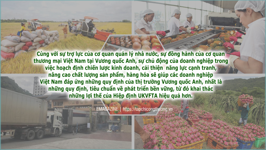 Bên cạnh đó, doanh nghiệp phải nghiên cứu kỹ các hiệp định thương mại như Hiệp định UKVFTA và cũng có thể tìm tham vấn ở các cơ quan, tổ chức có thể hỗ trợ cho các doanh nghiệp để có thể xuất khẩu được thuận lợi và thành công. Đồng thời tham vấn thêm ý kiến của Thương vụ Việt Nam tại Vương quốc Anh và nhận sự giúp đỡ của thương vụ để có thể kết nối đến những đối tác đáng tin cậy tại địa bàn sở tại...