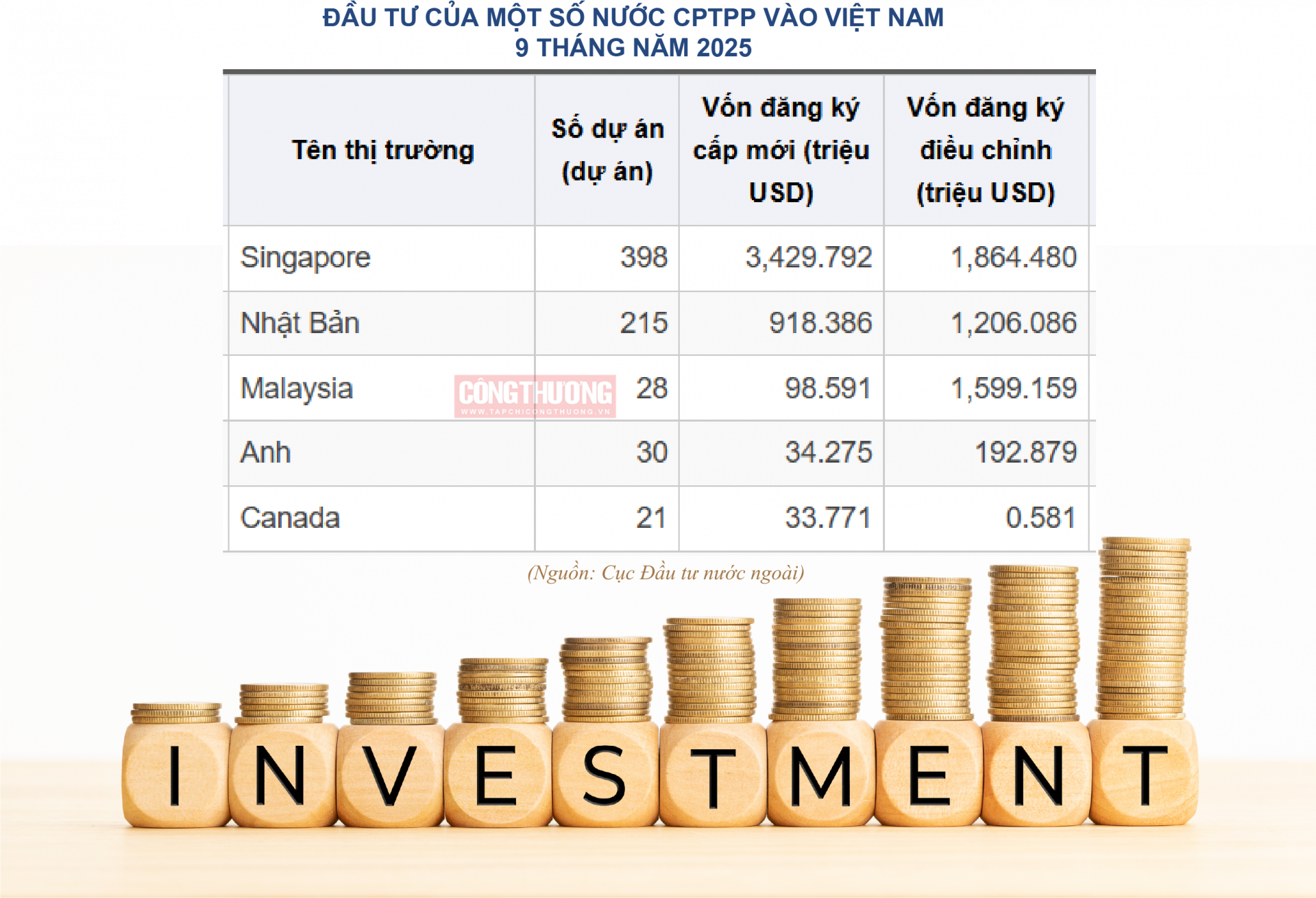 Theo số liệu mới nhất của Cục Đầu tư nước ngoài (Bộ Tài chính), sau 10 tháng năm 2025, tổng vốn đầu tư nước ngoài (FDI) đăng ký cấp mới của cả nước đạt 14,07 tỷ USD với 3.321 dự án được cấp phép, tăng 21,1% so với cùng kỳ năm trước về số dự án. Trong số 87 quốc gia và vùng lãnh thổ có dự án đầu tư được cấp phép mới tại Việt Nam trong 10 tháng qua, Singapore tiếp tục là nhà đầu tư lớn nhất với 3,76 tỷ USD, chiếm 26,7% tổng vốn đăng ký cấp mới; trong khi đó Nhật Bản xếp ở vị trí thứ 4 với 1,17 tỷ USD, chiếm 8,3% tổng vốn FDI đăng ký cấp mới. Đây là minh chứng cụ thể cho vị thế của các nhà đầu tư Thành viên Hiệp định CPTPP tại Việt Nam hiện nay.