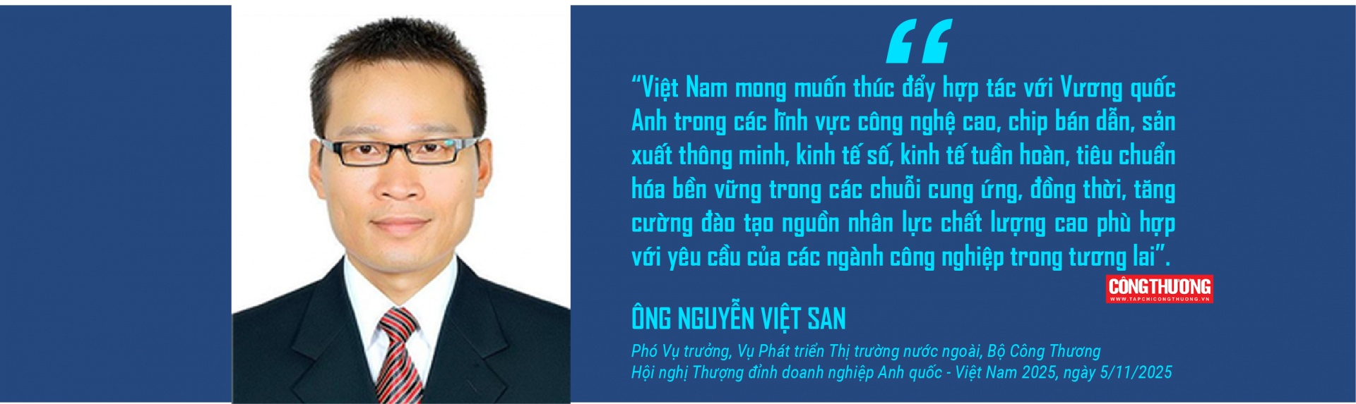 Về dịch vụ tài chính, Vương quốc Anh đang hỗ trợ Việt Nam trong xây dựng hai Trung tâm Tài chính quốc tế tại TP. Hồ Chí Minh và Đà Nẵng, tập trung vào hoàn thiện khung pháp lý, cơ chế giải quyết tranh chấp, tiêu chuẩn ESG và đào tạo nguồn nhân lực tài chính chất lượng cao.