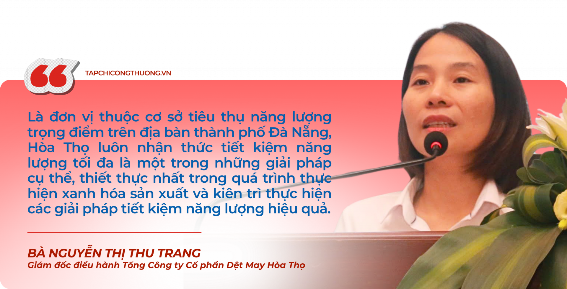 Bà Nguyễn Thị Thu Trang - Giám đốc điều hành Tổng Công ty Cổ phần Dệt May Hòa Thọ cho biết, Hòa Thọ luôn xem bảo vệ môi trường là nền tảng cho sự phát triển lâu dài, thể hiện qua nhiều giải pháp đầu tư đồng bộ cho sản xuất xanh - sạch - tuần hoàn.