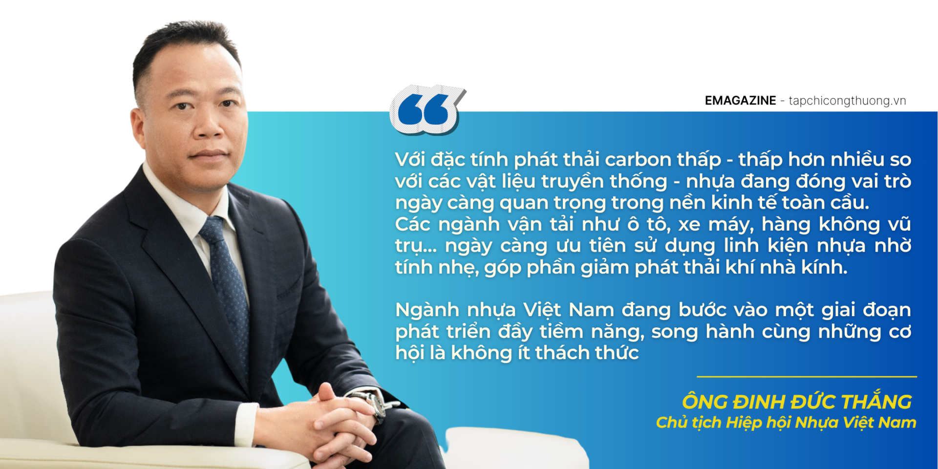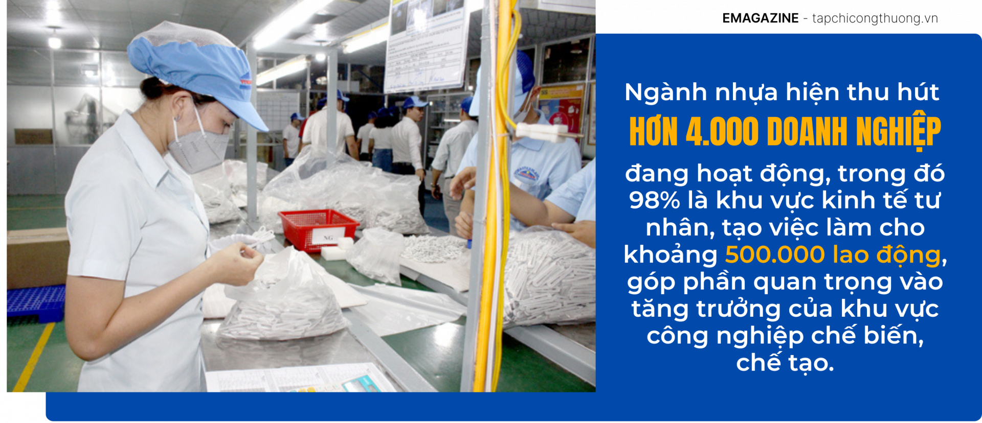 Theo Hiệp hội Nhựa Việt Nam (VPA), ngành nhựa ghi nhận tốc độ tăng trưởng trên 10%/năm trong những năm gần đây; riêng năm 2024 bứt phá mạnh mẽ gần 20%, đạt doanh thu hơn 31 tỷ USD. Ngành nhựa hiện thu hút hơn 4.000 doanh nghiệp đang hoạt động, trong đó 98% là khu vực kinh tế tư nhân, tạo việc làm cho khoảng 500.000 lao động, góp phần quan trọng vào tăng trưởng của khu vực công nghiệp chế biến, chế tạo.