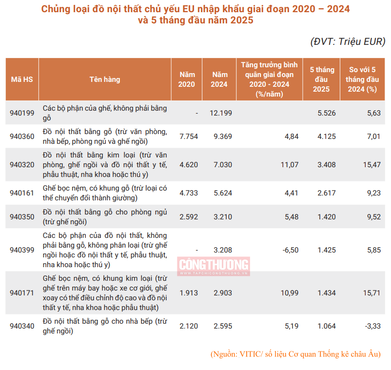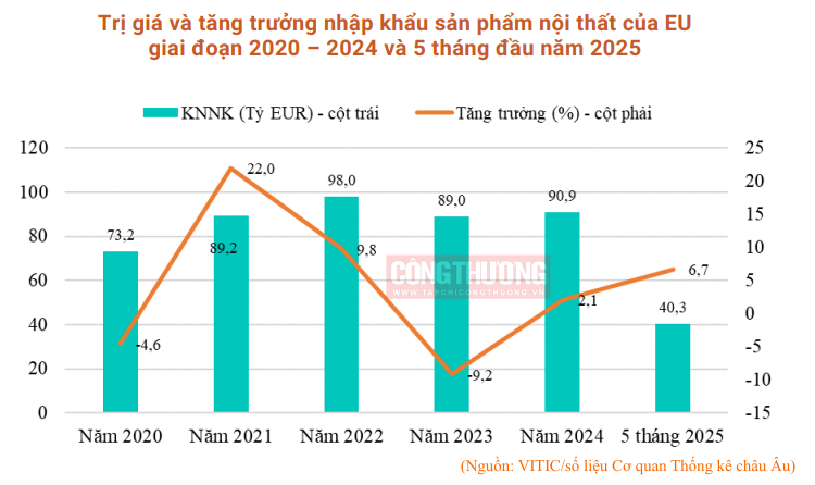 Việt Nam hiện là nguồn cung ngoại khối sản phẩm nội thất lớn thứ 4 cho EU. Theo số liệu của Cơ quan Thống kê châu Âu, giai đoạn 2020 - 2024, tốc độ nhập khẩu sản phẩm nội thất của EU từ Việt Nam tăng trưởng bình quân 2,73%/năm, từ 841 triệu EUR năm 2020 lên 936 triệu EUR năm 2024. Thị phần sản phẩm nội thất của Việt Nam chiếm 3,51% trong tổng kim ngạch nhập khẩu của EU từ thị trường ngoại khối vào năm 2024. Trong 5 tháng đầu năm 2025, EU tiếp tục tăng nhập khẩu sản phẩm nội thất từ Việt Nam, tăng 18,78% so với cùng kỳ năm ngoái, đạt 567 triệu EUR.
