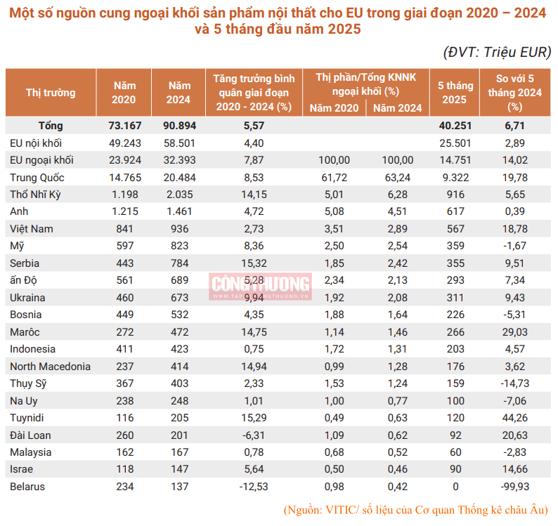 Về cơ cấu nguồn cung, thống kê cho thấy, các nguồn cung ngoại khối chủ yếu cung cấp sản phẩm nội thất cho EU gồm: Trung Quốc, Thổ Nhĩ Kỳ, Anh, Việt Nam, Mỹ, Serbia, Ấn Độ, Ukraina,... Trong giai đoạn 2020 - 2024, tốc độ nhập khẩu sản phẩm nội thất của EU từ tất cả các thị trường ngoại khối trên ghi nhận mức tăng trưởng khả quan. Xu hướng tăng trưởng nhập khẩu từ các nguồn cung ngoại khối trên tiếp tục diễn ra trong 5 tháng đầu năm 2025, ngoại trừ Mỹ.