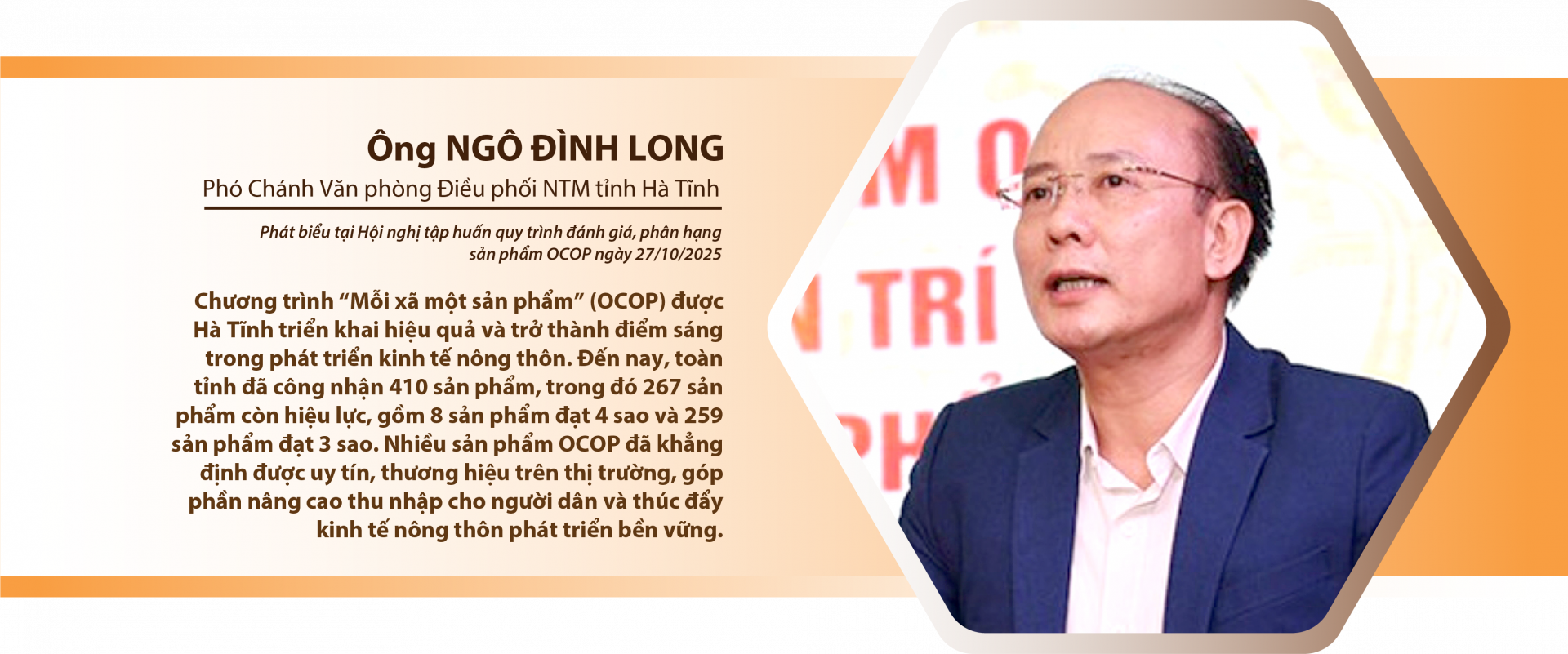 Tỉnh Hà Tĩnh đã đánh giá, công nhận 405 sản phẩm OCOP, 248 sản phẩm còn hiệu lực chứng nhận OCOP trong đó: 8 sản phẩm đạt 4 sao, 240 sản phẩm đạt 3 sao. Đã có 320 chủ thể tham gia Chương trình OCOP, trong đó: có 69 Hợp tác xã, 43 Doanh nghiệp, 31 tổ hợp tác, 177 hộ gia đình. Có 01/07 làng nghề có sản phẩm đạt chứng nhận OCOP (đạt 14%).