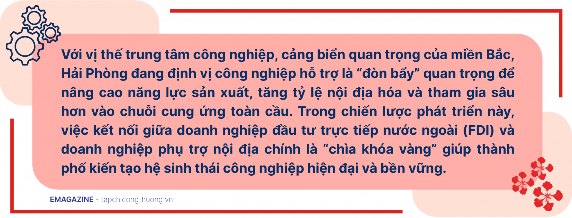 Theo lãnh đạo Sở Công Thương Thành phố Hải Phòng, công nghiệp hỗ trợ giữ vai trò đặc biệt quan trọng trong quá trình phát triển kinh tế - xã hội của thành phố. Đây là nền tảng trực tiếp thúc đẩy các ngành công nghiệp chủ lực phát triển bền vững.
