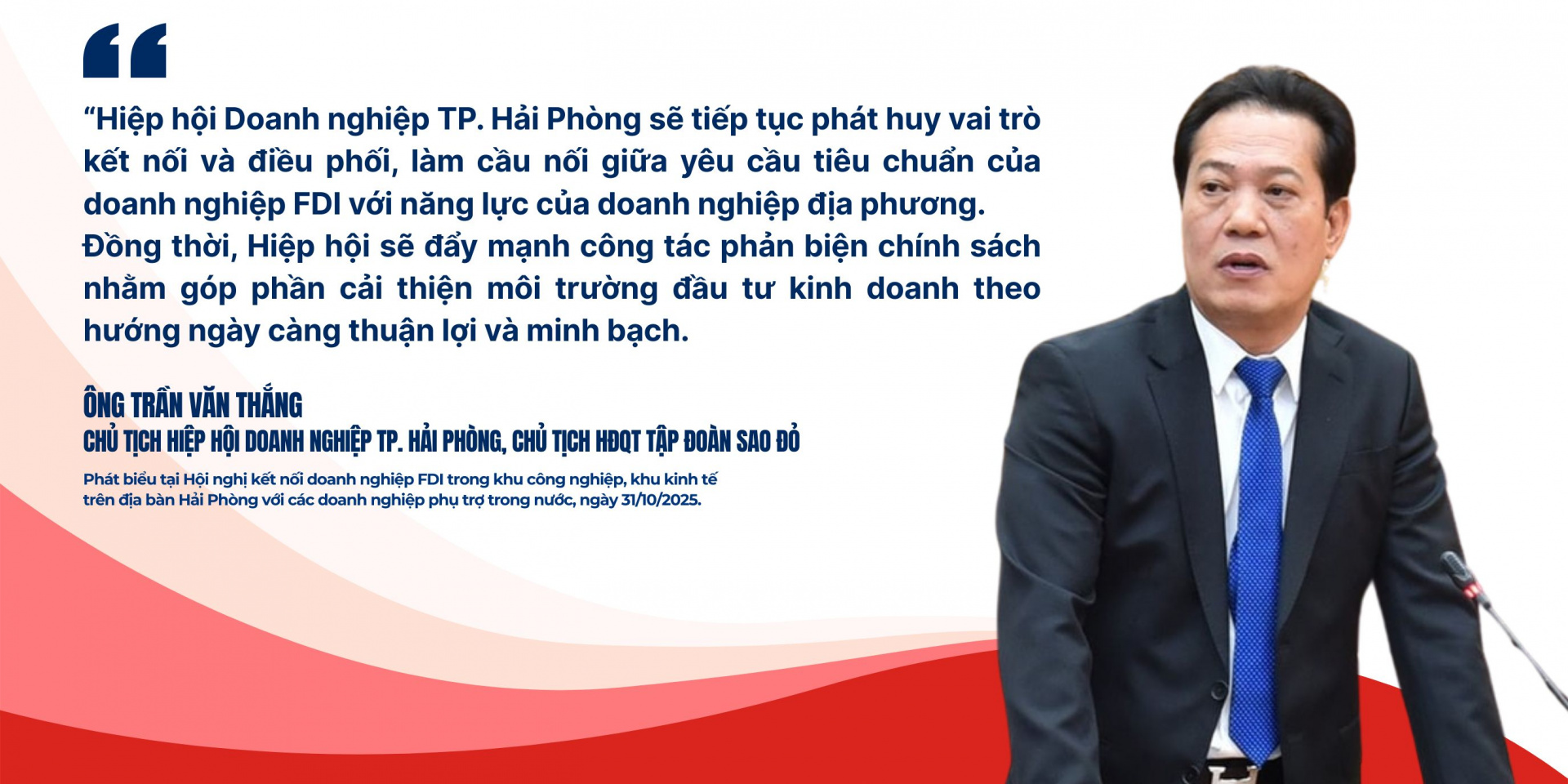 Theo ông Trần Văn Thắng - Chủ tịch Hiệp hội doanh nghiệp TP. Hải Phòng, Chủ tịch HĐQT Tập đoàn Sao Đỏ, muốn vào sâu chuỗi FDI thì doanh nghiệp công nghiệp hỗ trợ phải đáp ứng các yêu cầu về chất lượng, tiến độ, chi phí và sự tuân thủ các tiêu chuẩn và pháp lý. Song song đó, cần có sự đồng hành quyết liệt của Ban Quản lý và chính quyền thành phố. Khi FDI minh bạch nhu cầu, UBND Thành phố chỉ đạo, Ban Quản lý điều phối, doanh nghiệp công nghiệp hỗ trợ nâng chuẩn và chủ động, thì mỗi phiên kết nối sẽ ra nhiều đơn đặt hàng, chứ không dừng ở hình thức.