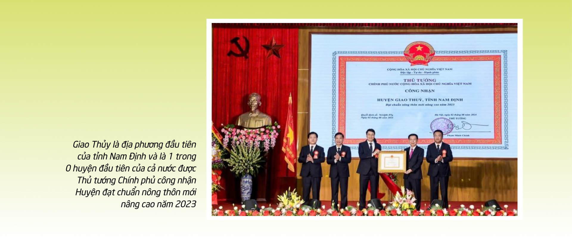 Giao Thuỷ sau khi được công nhận huyện đạt chuẩn NTM nâng cao, UBND tỉnh đã có Quyết định số 1996/QĐ-UBND, ngày 24/9/2024, phê duyệt Kế hoạch xây dựng huyện Giao Thuỷ đạt chuẩn nông thôn mới kiểu mẫu năm 2024 nổi trội lĩnh vực Giáo dục; đến nay đã có 03/04 nội dung đánh giá đạt theo quy định.