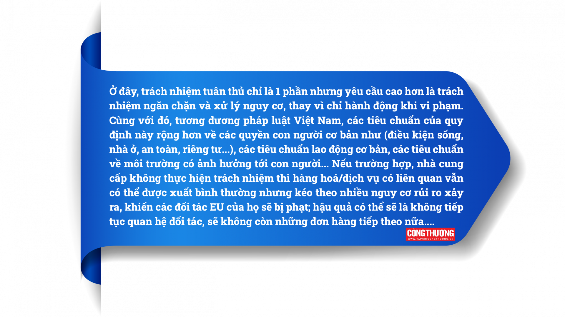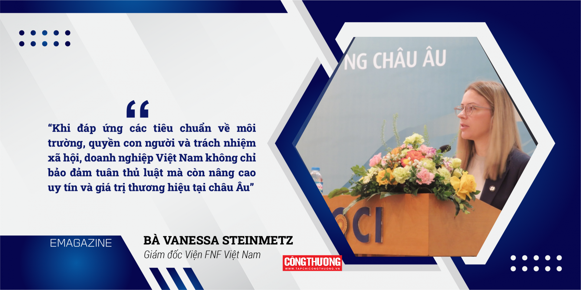 Theo bà Steinmetz, khi đáp ứng các tiêu chuẩn về môi trường, quyền con người và trách nhiệm xã hội, doanh nghiệp Việt Nam không chỉ bảo đảm tuân thủ luật mà còn nâng cao uy tín và giá trị thương hiệu. “Minh bạch và bền vững là chìa khóa để mở rộng hợp tác với các đối tác châu Âu”, chuyên gia này nhấn mạnh.