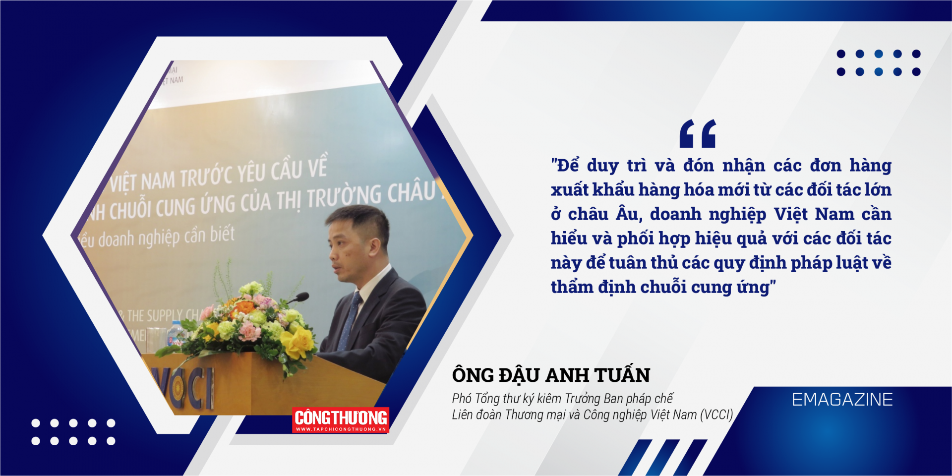 Phó Tổng thư ký VCCI nhấn mạnh: Mặc dù đối tượng áp dụng của các quy định thẩm định chuỗi cung ứng chỉ bao gồm các doanh nghiệp lớn, quá trình thực thi lại bao trùm tất cả các chủ thể tham gia vào các chuỗi cung ứng của các doanh nghiệp này với các tư cách khác nhau như nhà cung ứng nguyên liệu linh kiện phụ tùng đầu vào, nhà sản xuất chế biến, nhà vận chuyển....