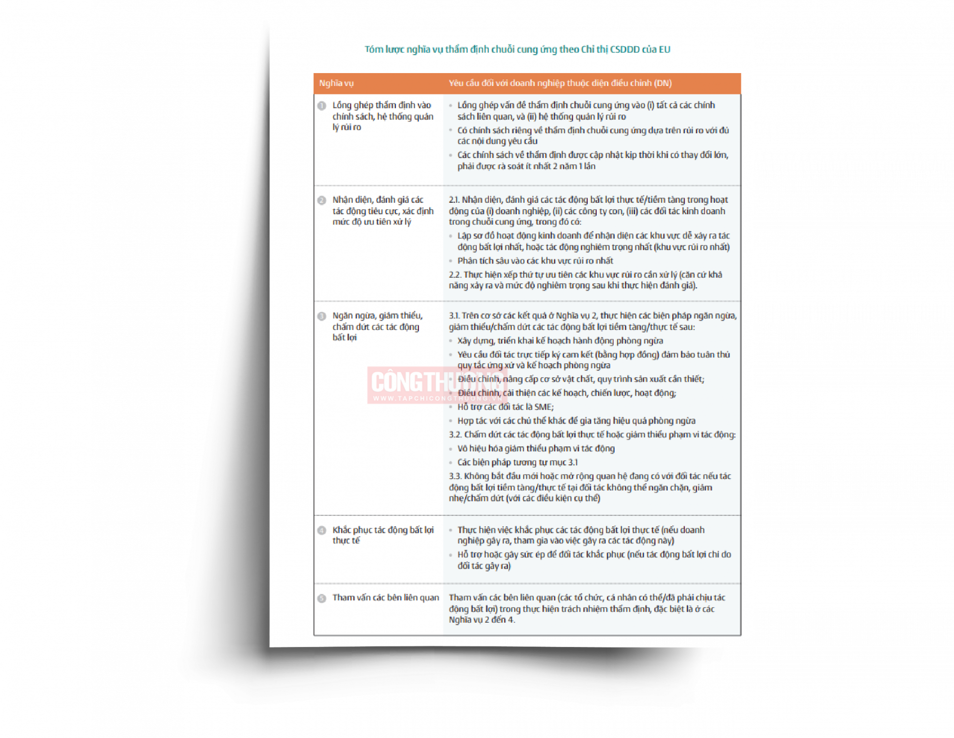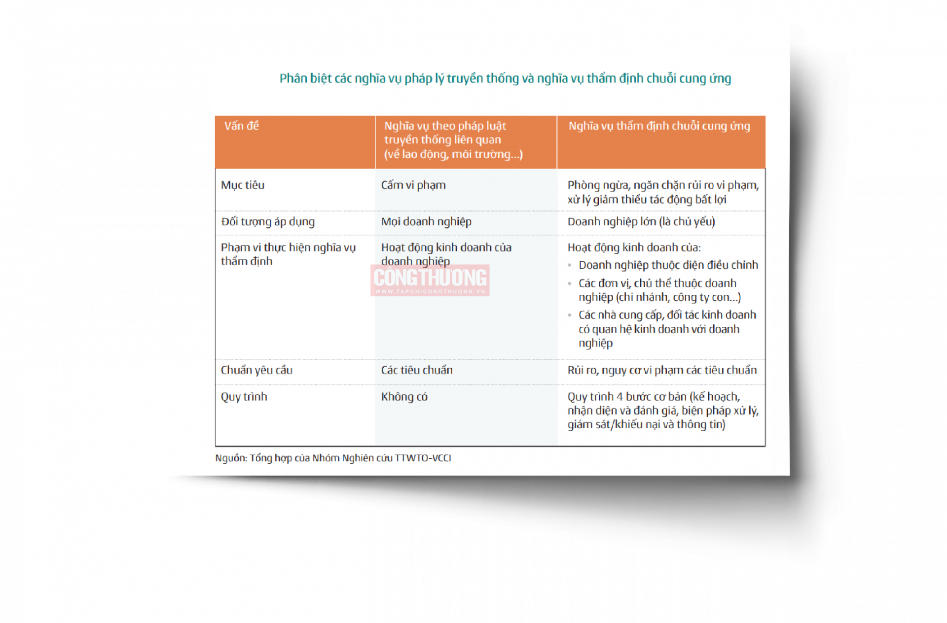 Trong thời gian gần đây, Liên minh châu Âu (EU) và một số nước thành viên đang thiết lập các quy định pháp luật mới về thẩm định chuỗi cung ứng (supply-chain due diligence) nhằm giám sát, ngăn chặn và xử lý các rủi ro về quyền con người và môi trường trong chuỗi cung ứng trên toàn cầu của các doanh nghiệp lớn tại khu vực này.