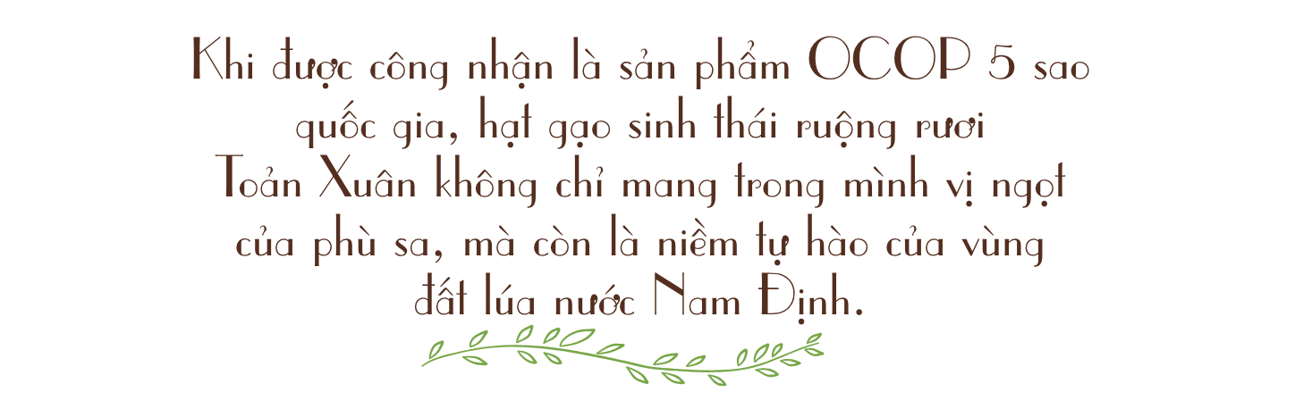 Đến tháng 6/2025, Bộ Nông nghiệp và Môi trường công nhận “Gạo sinh thái ruộng rươi Toản Xuân” đạt OCOP 5 sao quốc gia, chính thức đưa sản phẩm từ một thương hiệu địa phương trở thành đại diện tiêu biểu của nông nghiệp sinh thái Việt Nam.