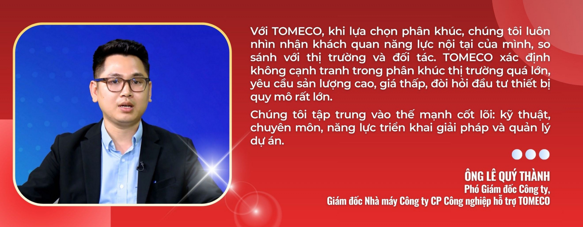 Ông Lê Quý Thành - Phó Giám đốc Công ty, Giám đốc Nhà máy Công ty CP Công nghiệp hỗ trợ TOMECO chia sẻ rằng, ở cấp độ doanh nghiệp, những sức ép này được cảm nhận rất rõ: doanh nghiệp buộc phải tính toán lại chiến lược cạnh tranh, phân khúc thị trường, cách tiếp cận tiêu chuẩn và con đường đầu tư công nghệ nếu muốn tồn tại và đi xa.