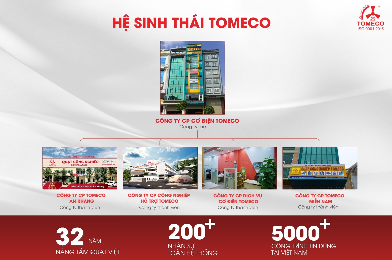Khởi nguồn là một doanh nghiệp cơ khí, TOMECO đã tích lũy hơn 30 năm kinh nghiệm trong lĩnh vực nghiên cứu, thiết kế và chế tạo thiết bị công nghiệp, đặc biệt là quạt công nghiệp, dịch vụ quạt công nghiệp và sản phẩm OEM cơ khí. Trải qua quá trình phát triển, TOMECO không chỉ dừng lại ở một nhà máy đơn lẻ mà đã hình thành hệ sinh thái với công ty mẹ và các công ty thành viên như TOMECO An Khang, Công nghiệp hỗ trợ TOMECO, Dịch vụ cơ điện TOMECO, TOMECO Miền Nam, với hơn 200 nhân sự và trên 5.000 công trình tin dùng trong nước.