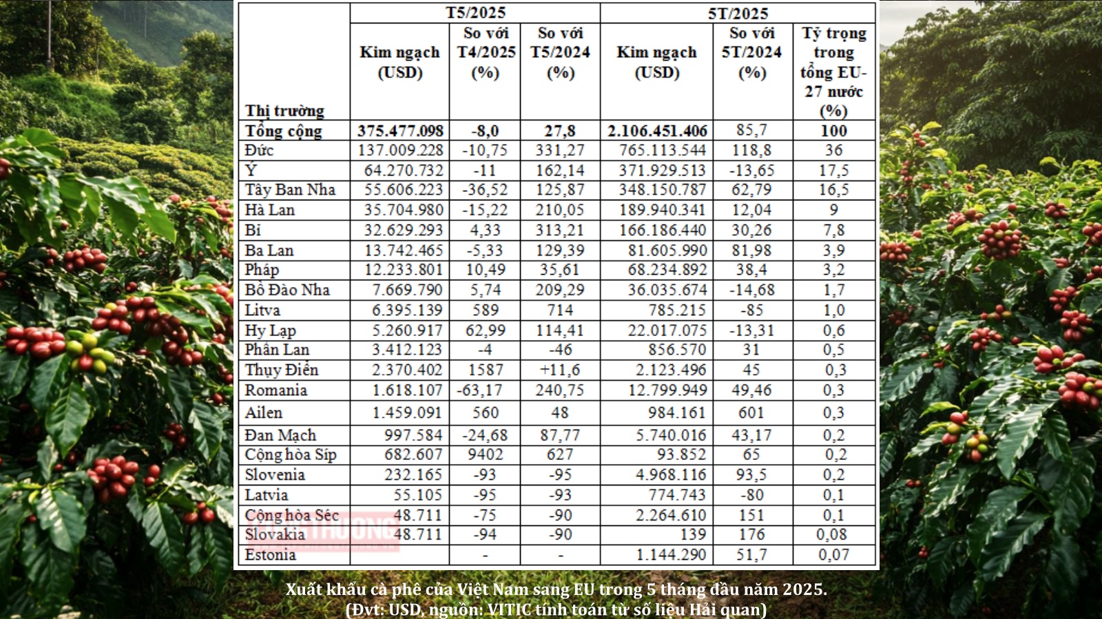 Từ đầu năm 2025, xuất khẩu cà phê của Việt Nam sang thị trường EU tiếp tục thuận lợi với kim ngạch và giá xuất khẩu đều tăng so với cùng kỳ năm trước. Các thị trường tiêu thụ cà phê lớn nhất của Việt Nam trong khối này lần lượt là Đức, Italia, Tây Ban Nha, Hà Lan, Bỉ...