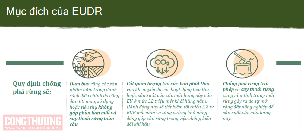 Được ban hành ngày 23/6/2023, Quy định của EU về sản phẩm không gây phá rừng (European Union Deforestation Regulation - EUDR) ban đầu được ấn định có hiệu lực từ ngày 30/12/2024, trước mắt áp dụng yêu cầu 7 nhóm mặt hàng (cà phê, dầu cọ, gỗ, cao su, thịt gia súc, ca cao và đậu tương) xuất khẩu vào EU phải truy xuất nguồn gốc, không liên quan đến phá rừng sau ngày 31/12/2020. Doanh nghiệp vi phạm sẽ bị phạt đến 4% doanh thu và bị loại khỏi thị trường EU.